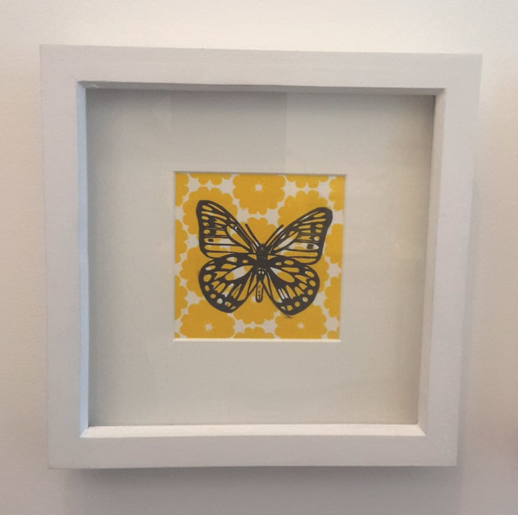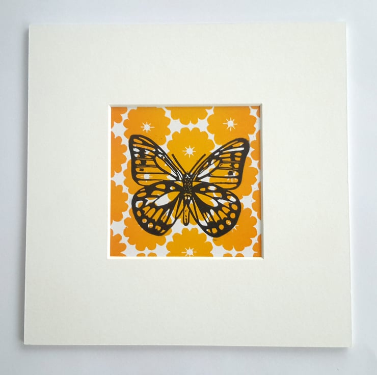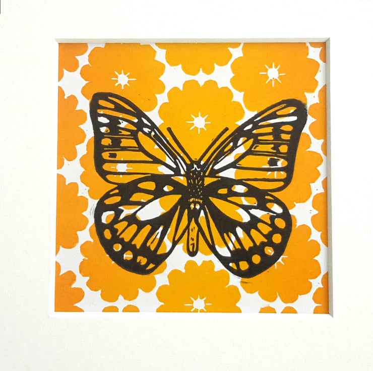 A lino printed butterfly with a cheerful orange flowery background.