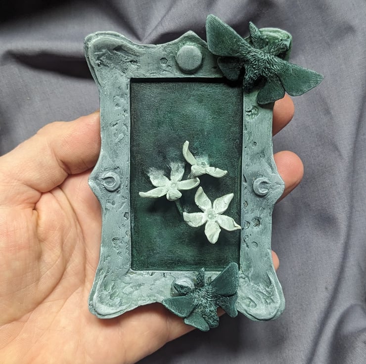 The symbolism of mirrors is an interesting idea to play with, although it doesn't have an actual mirror plate in, the surface of the mirror is meant to offer up the idea that mirrors are gateways to an unseen world. With in the Pale House they are small doorways where moths, ivy and flowers burst forth, bathed in a gentle glow, akin to moon light.