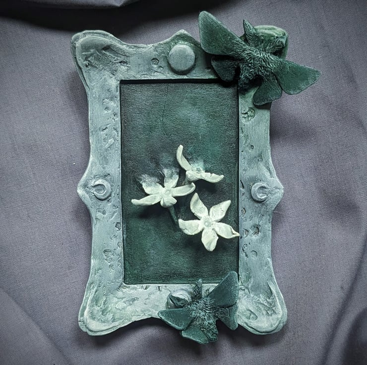 Small mirror sculpture made from cast resin and painted. The work measures approx 13x9cm and has a metal fastening in the back for hanging. Each one is unique and ready for display. All the parts to this sculpture are made by myself, sculpting originals out of epoxy clay, making silicon moulds and then casting the individual pieces. Each sculpture is assembled and hand painted.