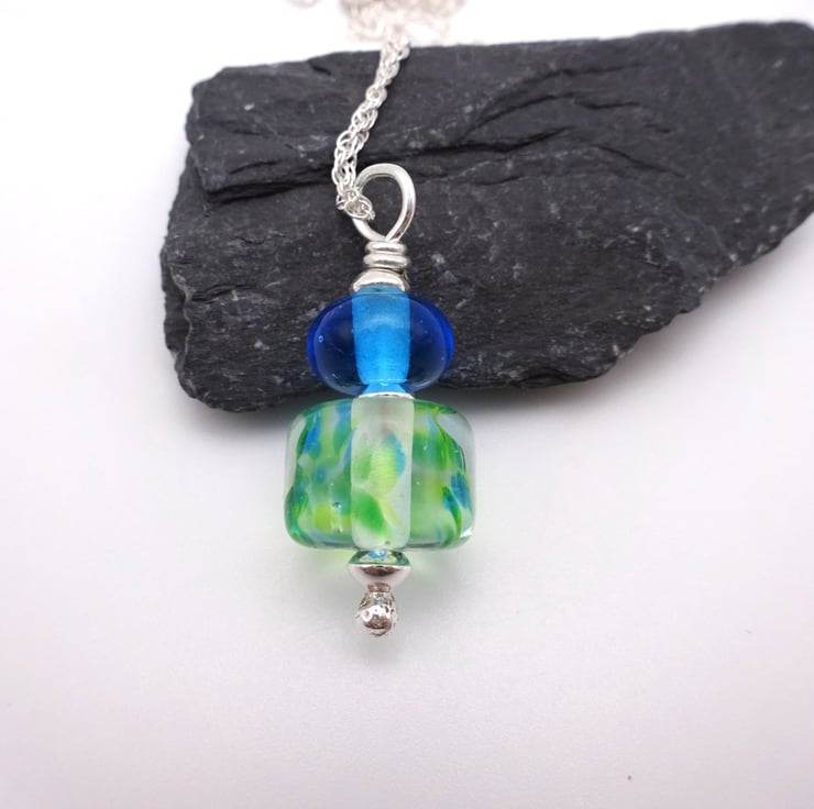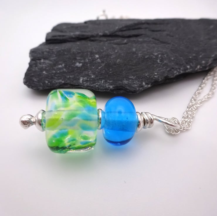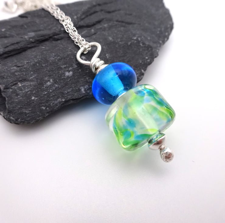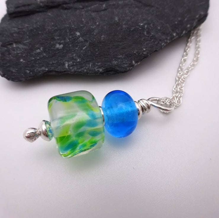 It features a sterling silver chain strung with a handmade lampwork green and blue glass pendant.