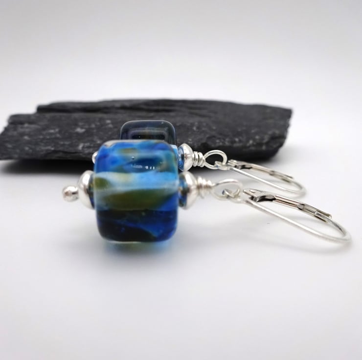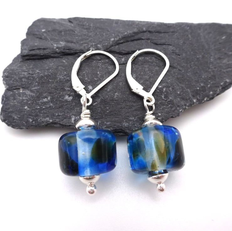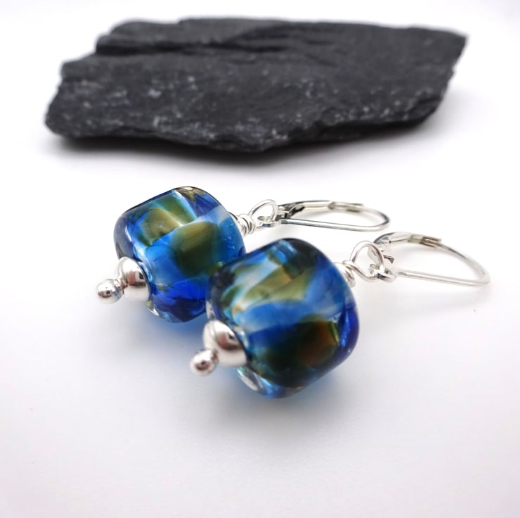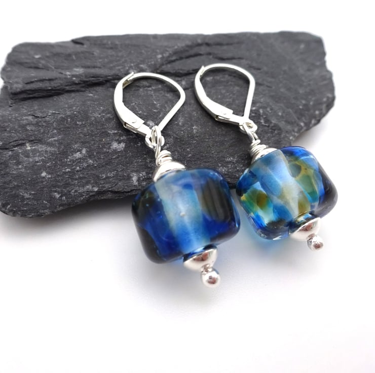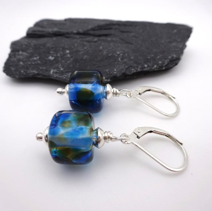 They feature sterling silver lever back ear wires and handmade lampwork blue and brown glass beads.