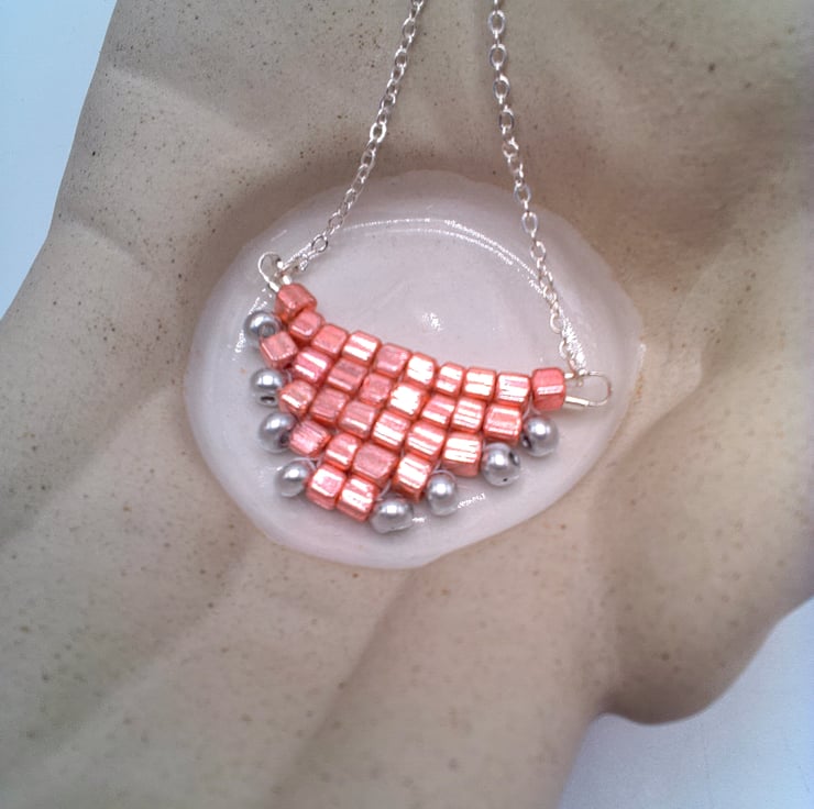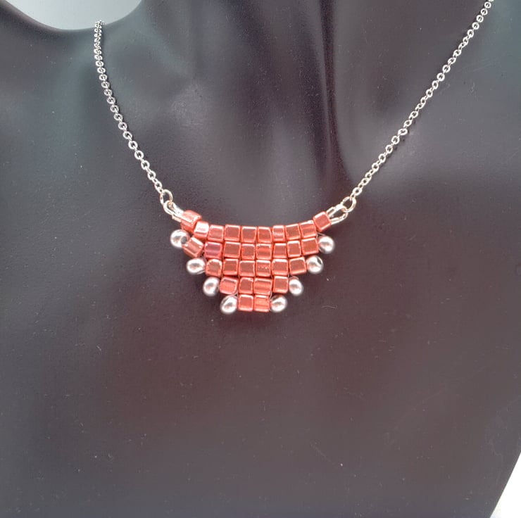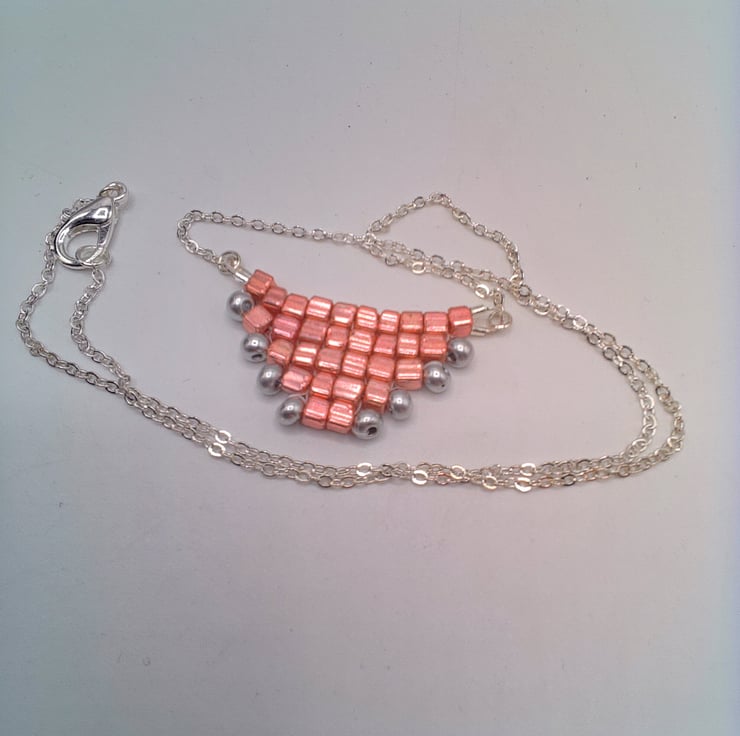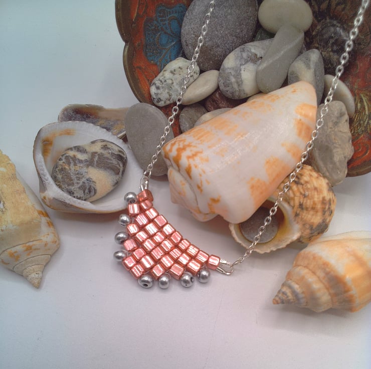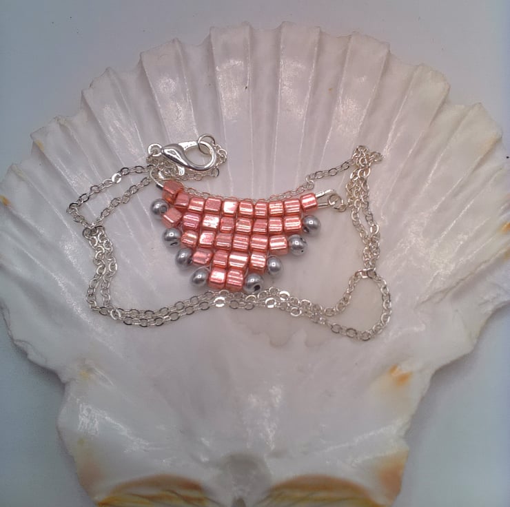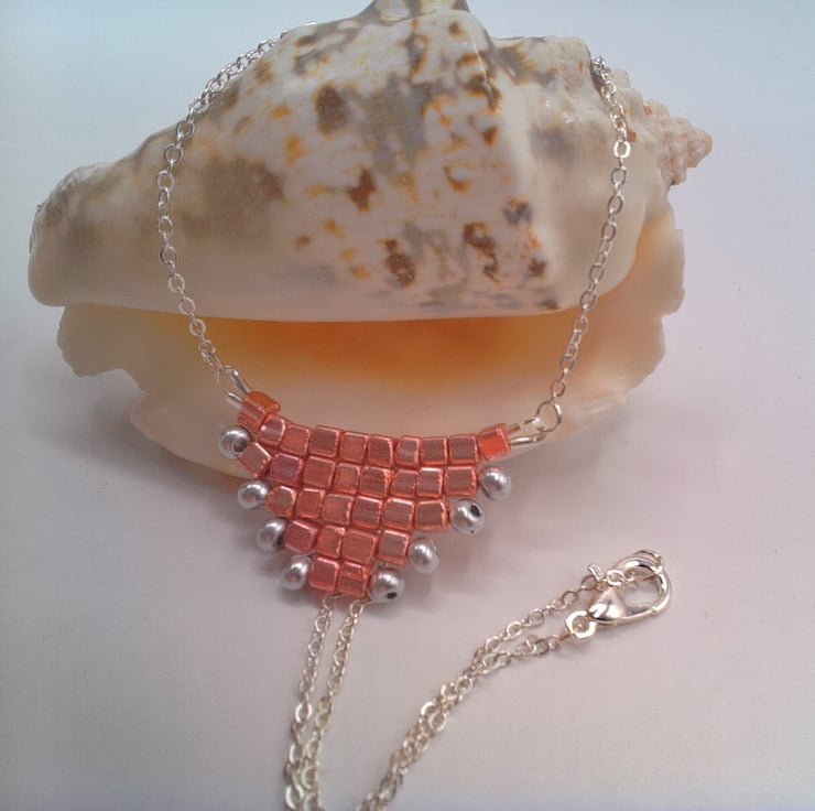 This gorgeous hand sewn metallic pink and silver beaded pyramid necklace would go well with any outfit you wear everyday or for an evening out. It would also make an ideal gift for your friends or relatives for a birthday or anniversary or as a Christmas gift. It would also make a perfect treat for yourself. The necklace centre is made by sewing together thirty 3 mm metallic pink square beads and eight 3 mm silver seed beads to form a pyramid shape. This is then suspended on two pieces of chain 8 inches (20 cm) long. The pyramid pendant measures 1.5 inches (4 cm) by 0.75 inches (2 cm). The overall length of the necklace is 18 inches (46 cm). The necklace will be dispatched wrapped in tissue paper in an organza bag and delivered to you via Royal Mail 1st class post.
