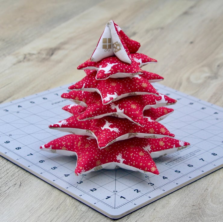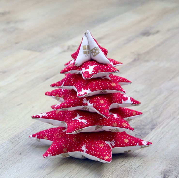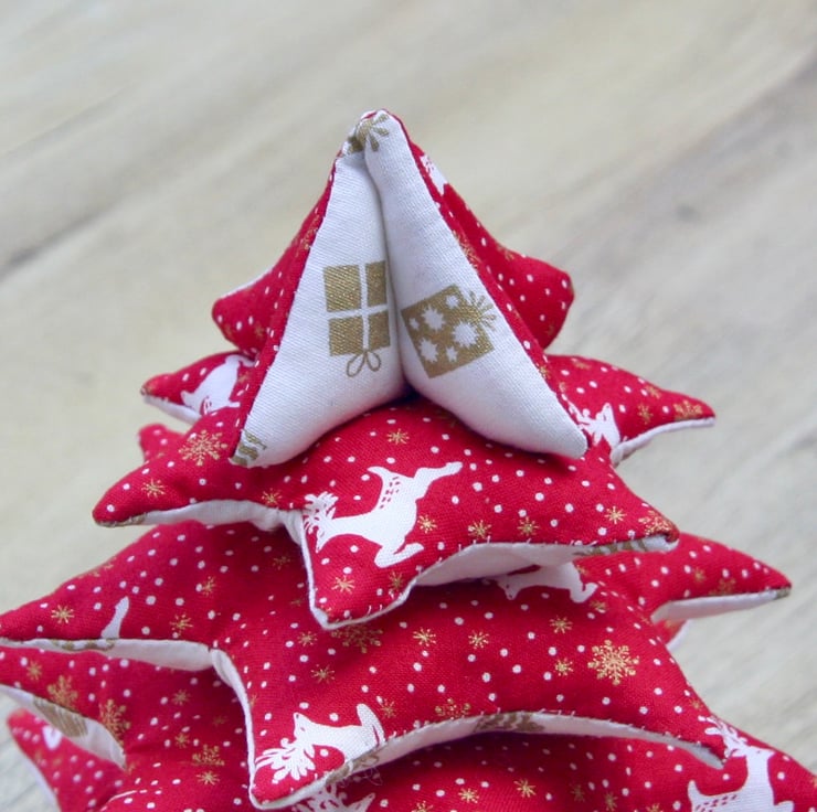 The tree is approximately 22cm tall and approximately 20cm in diameter across at the base. It is made up of 6 sections. Each section is made of 2 star shaped pieces machine sewn together and stuffed with polyester stuffing. The top section is triangular pieces sewn together to form the top of the tree. They are made from 100% cotton which is red with a reindeer and stars on the top of each star and white with gold parcels on the bottom of each star.. The bottom is secured with a button to help hold it all together.