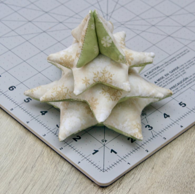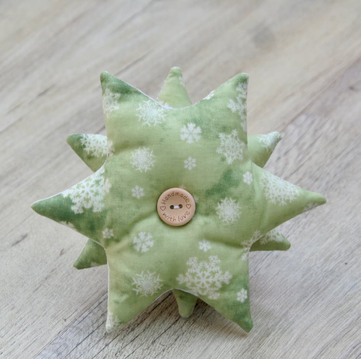 The cotton is a cream and gold snowflake design on the top of each star and green and white snowflake design on the bottom of each star. The bottom is secured with a button to ensure it all holds together beautifully.