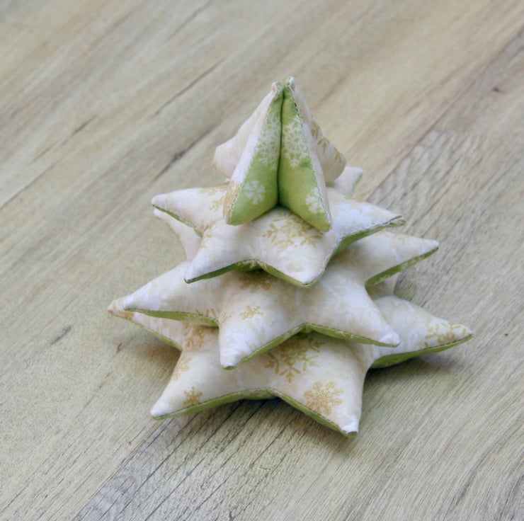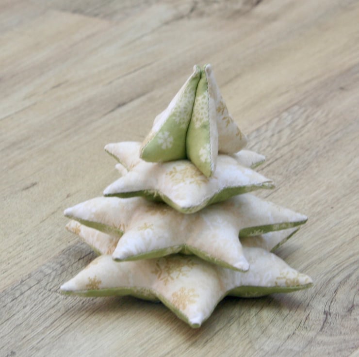 The tree is approximately 14cm tall and approximately 15cm in diameter across at the base. It is made up of 4 sections. The first 3 sections are made up of 2 pieces of star shaped high quality cotton, machine sewn together and stuffed with polyester stuffing. The top section is triangular pieces sewn together to form the top of the tree. I finish by hand sewing the gap closed and then sewing the pieces together, again by hand.