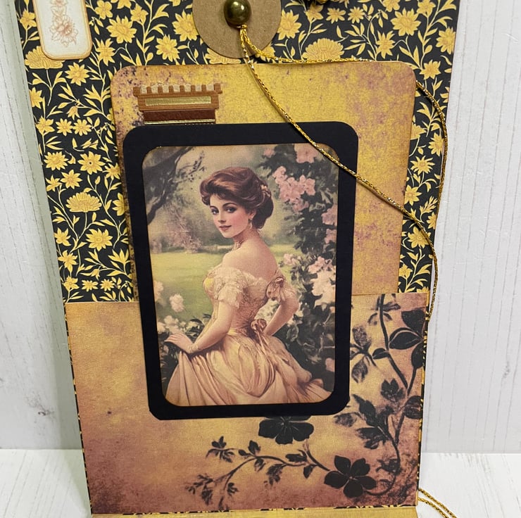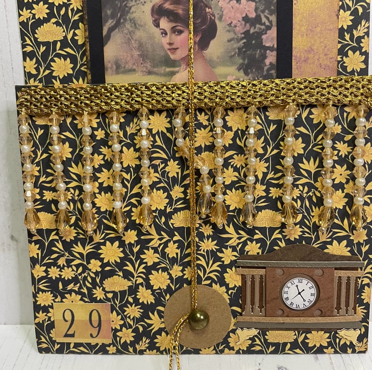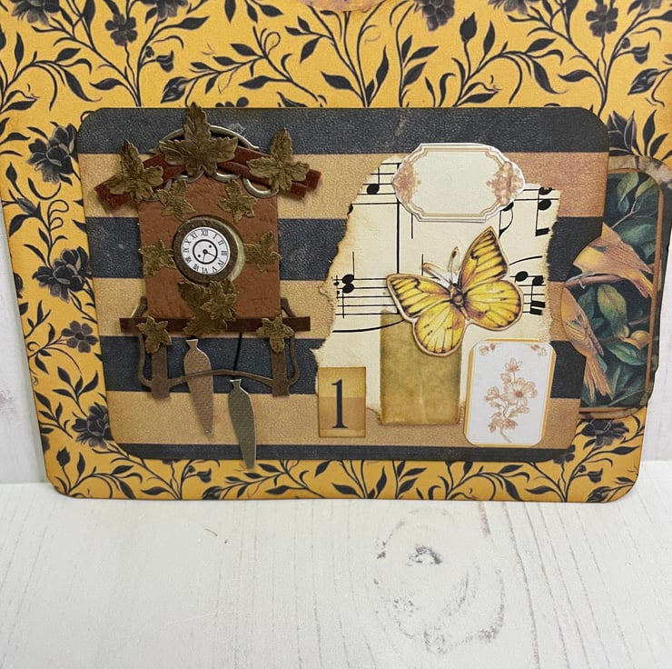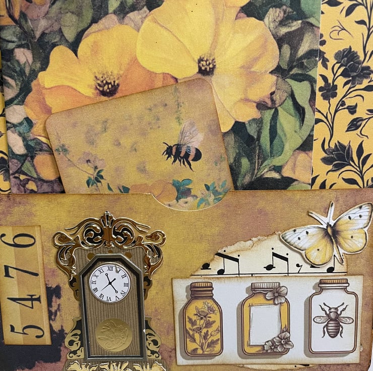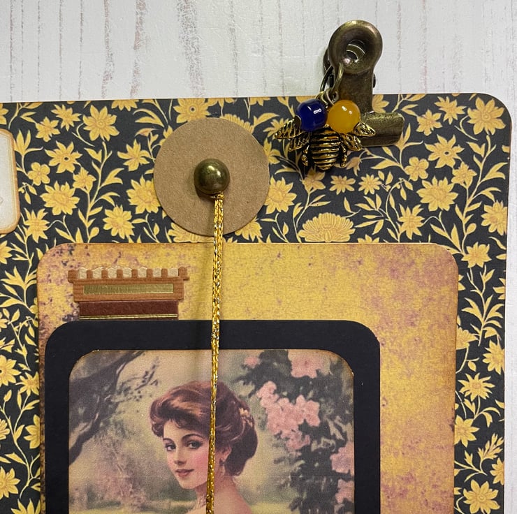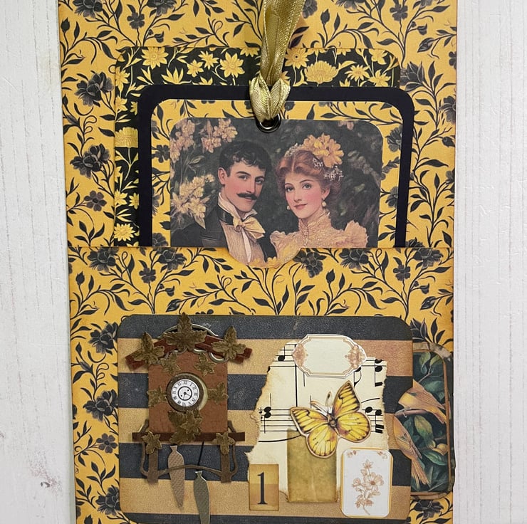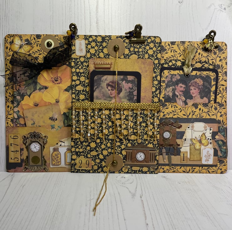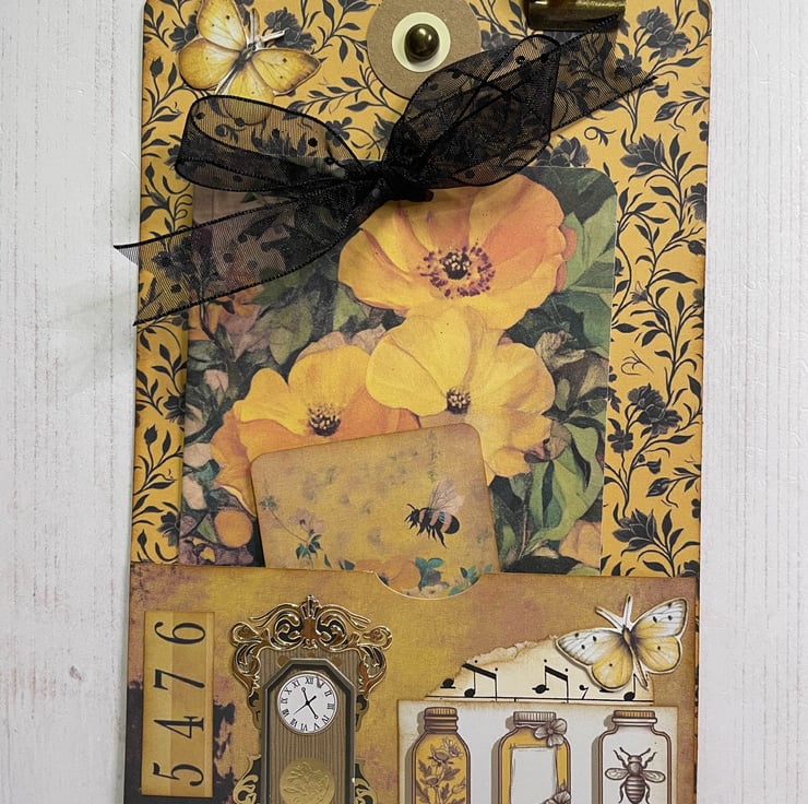 Stunning black and gold design print, decorated with mini bull dog clips with beads and bee charms., ribbon, vintage clock toppers, music paper and butterfly handcut fussy cuts.