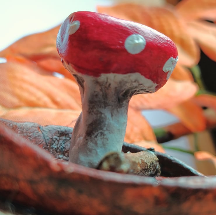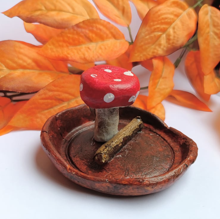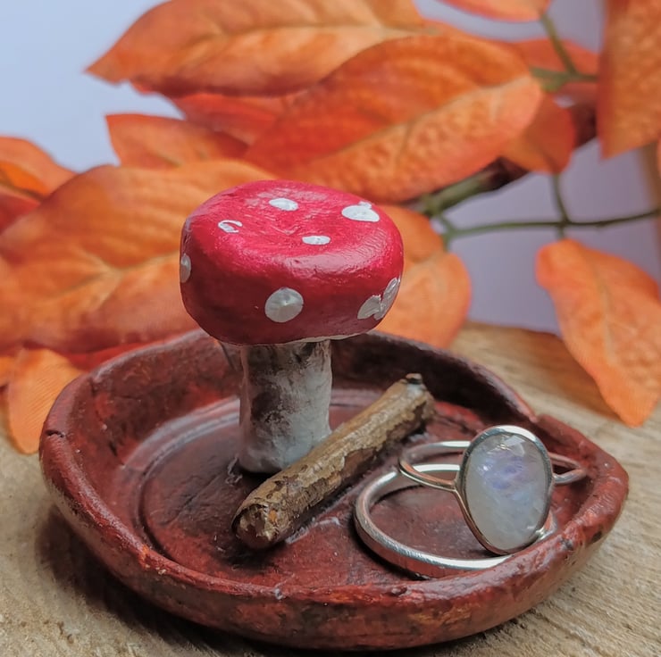 Cheery toadstool growing next to a found twig nestled in a fallen leaf. This autumnal trinket dish will keep your treasures safe or can just be used as decoration.