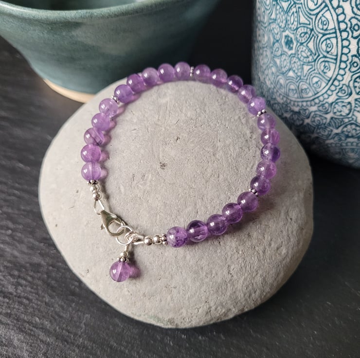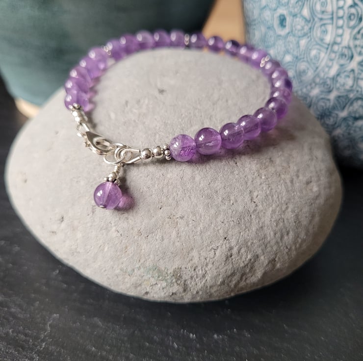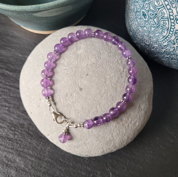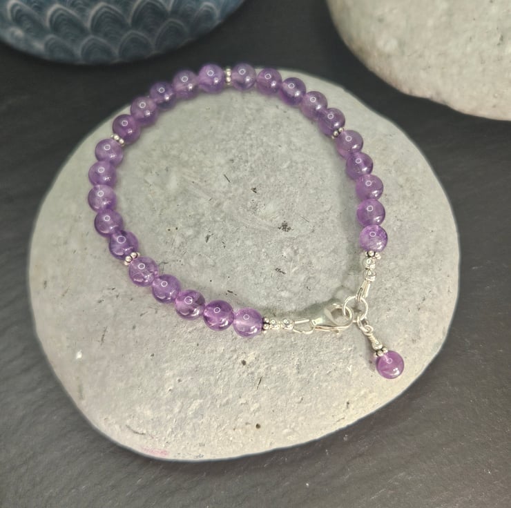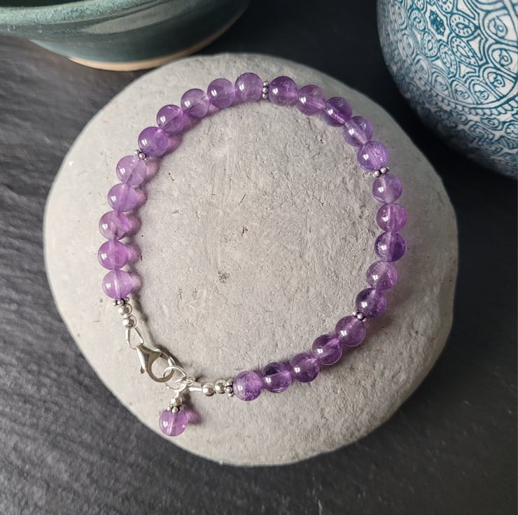 This pretty bracelet is made with Grade A 6mm round amethyst gemstones which have a beautiful purple colouring and clarity. The gemstones are interspaced with sterling silver Bali flower-shaped spacers and a matching gemstone bead is featured as a signature charm next to the clasp. The bracelet fastens with a sterling silver carabiner clasp and is threaded on strong and flexible 49-strand jewellery wire. All the metal components of the bracelet are sterling silver.