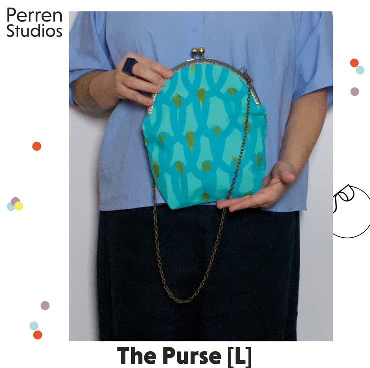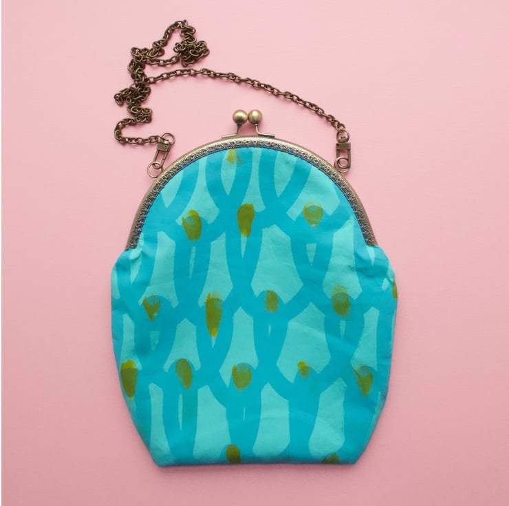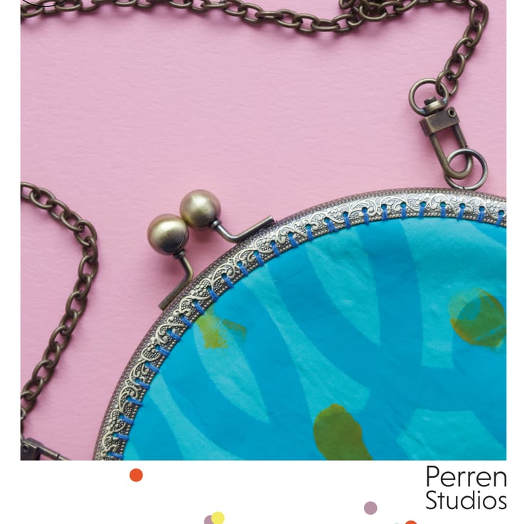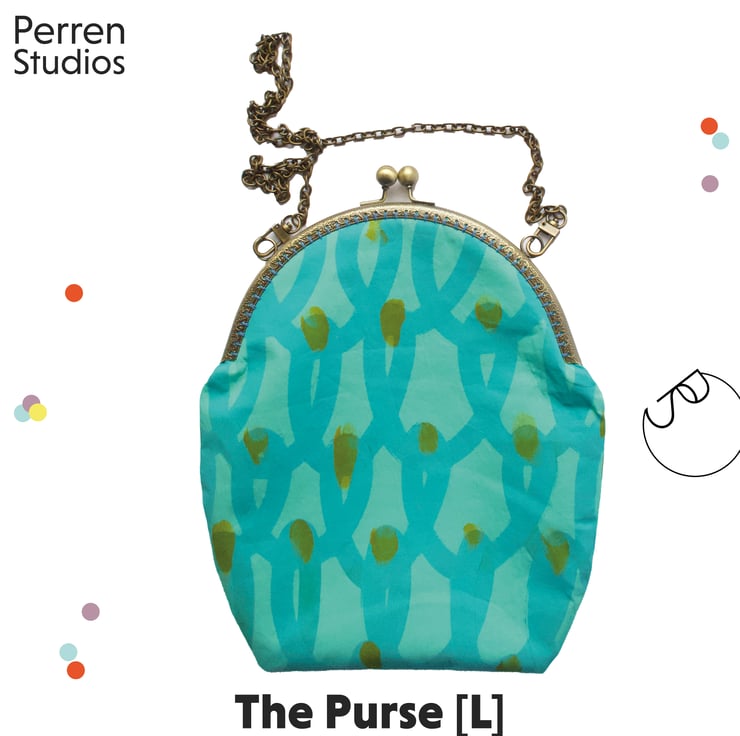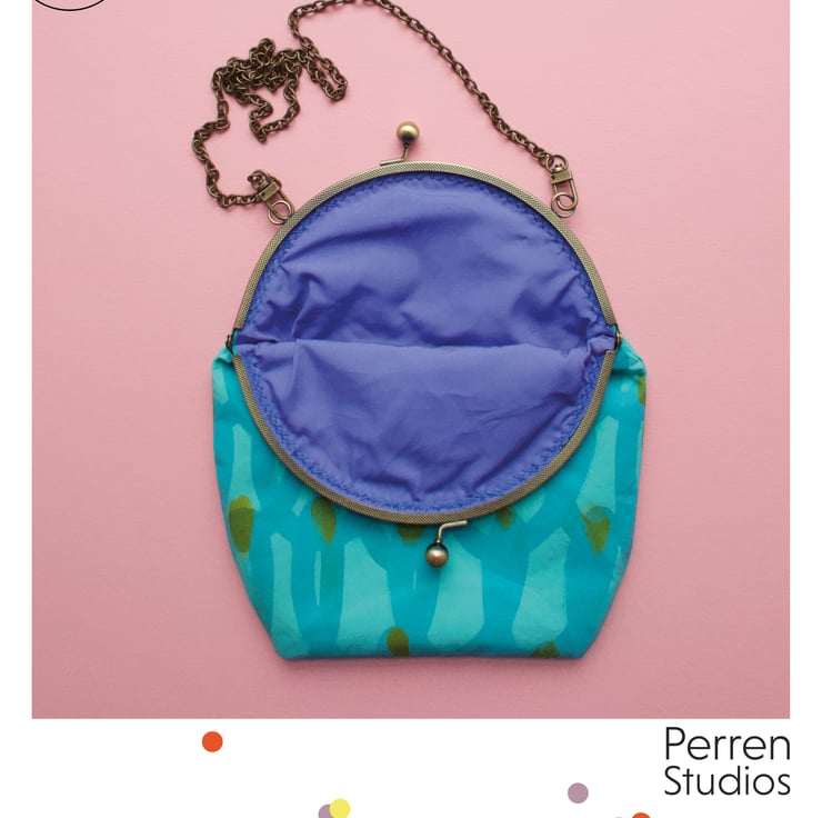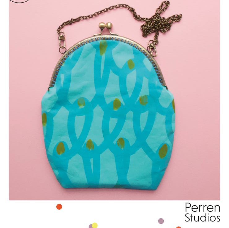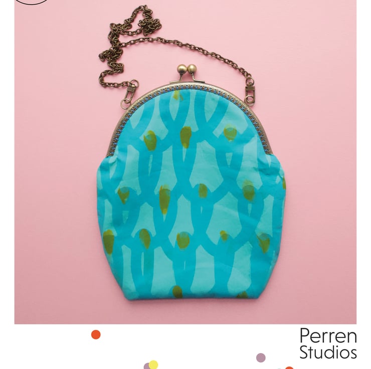 With a metal frame, kiss clasp and chain, this handmade purse uses the supreme Art Gallery Fabrics, premium quality 100% cotton - Oeko Tex certified. It is fully lined, has a separating pocket and has a Perren Studios label.