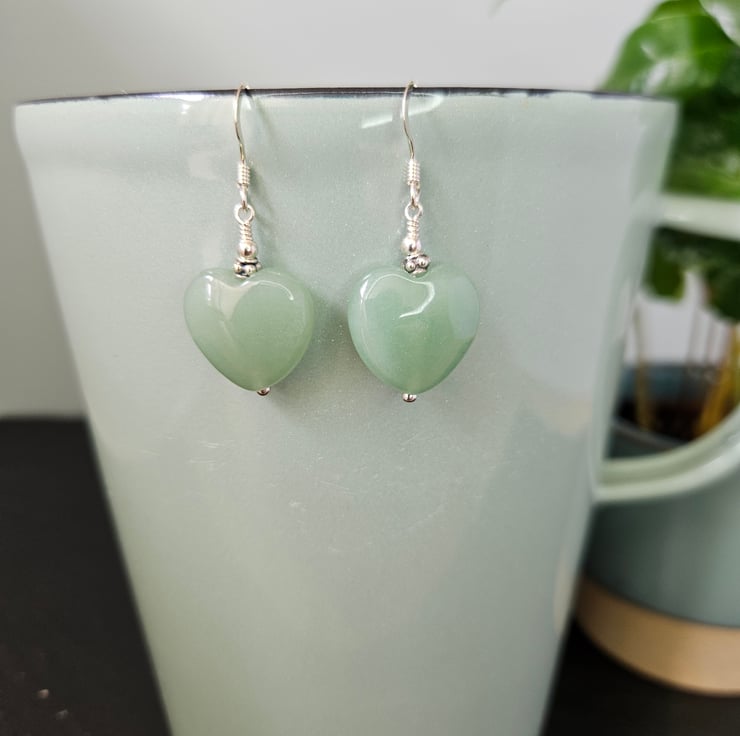 In a beautiful soft green shade, these pretty earrings are made with heart-shaped green aventurine gemstones and are complimented with decorative Bali beads. All the metal components of the earrings are sterling silver.