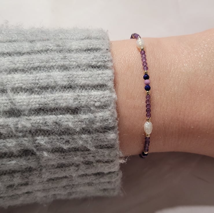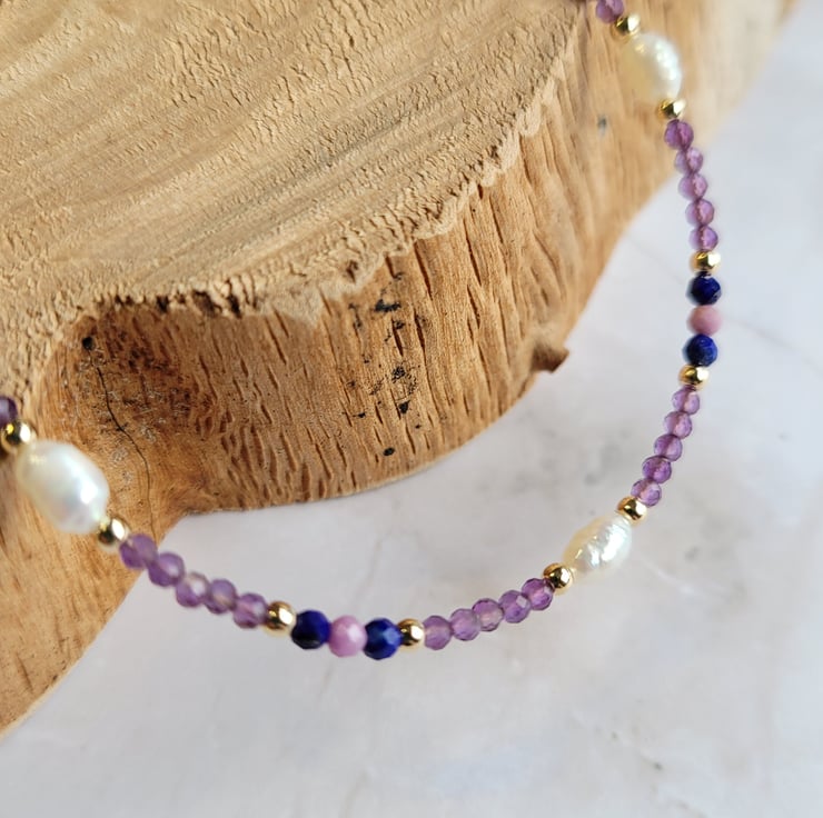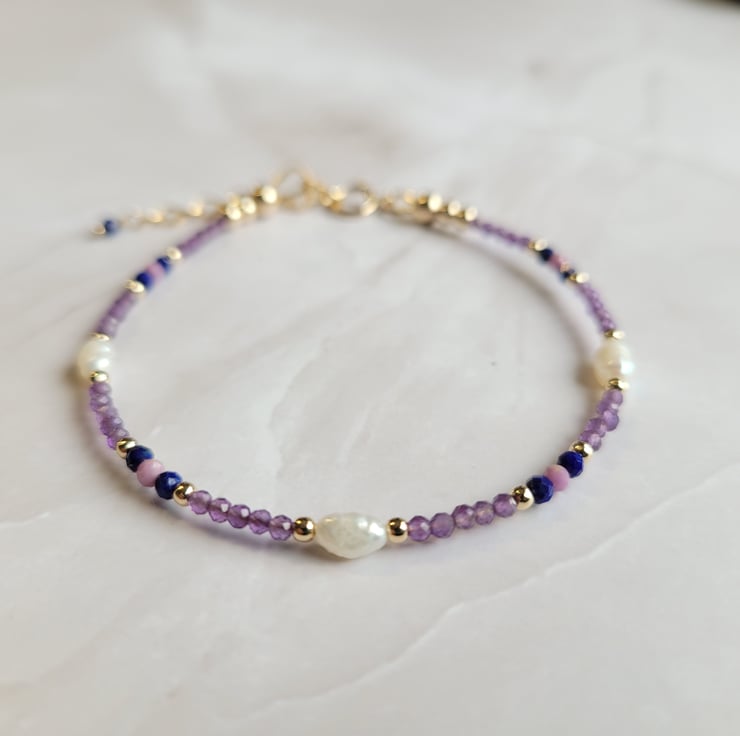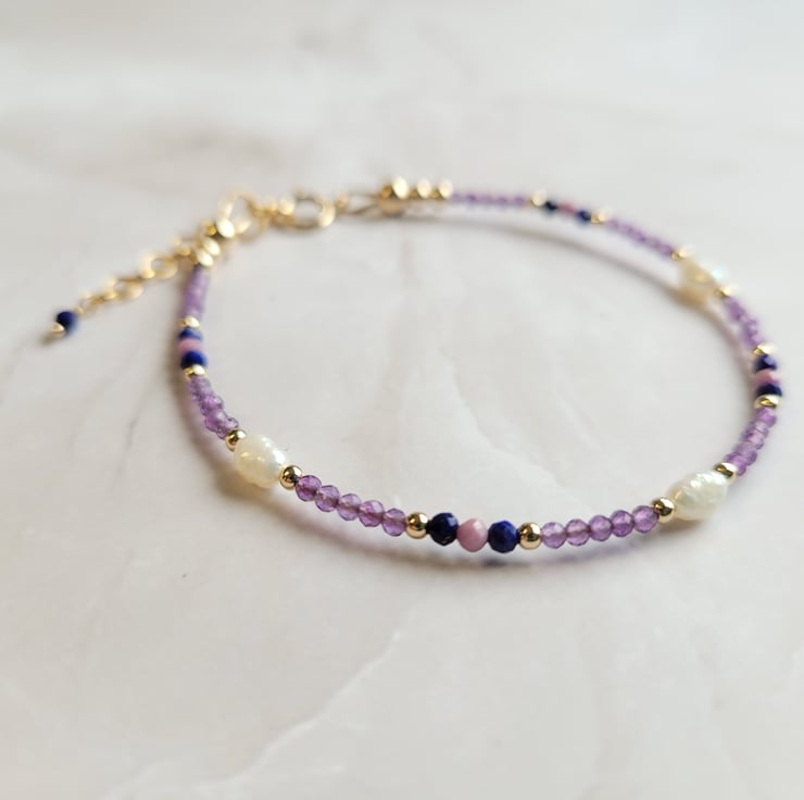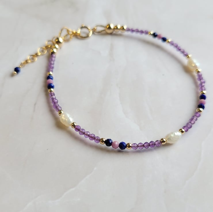 Gold filled beaded gemstone bracelet handmade with freshwater pearls and semi precious amethyst, lapis lazuli and phosphosiderite beads. The gemstones are spaced with gold filled beads, and the bracelet is finished with a gold filled spring ring clasp and extension chain offering a variable length of 17-20cm.