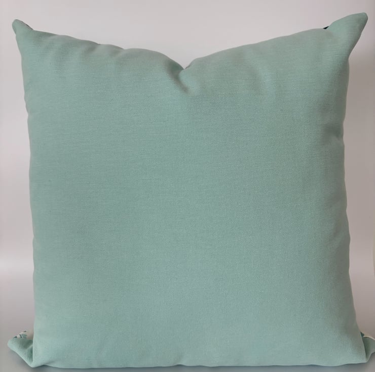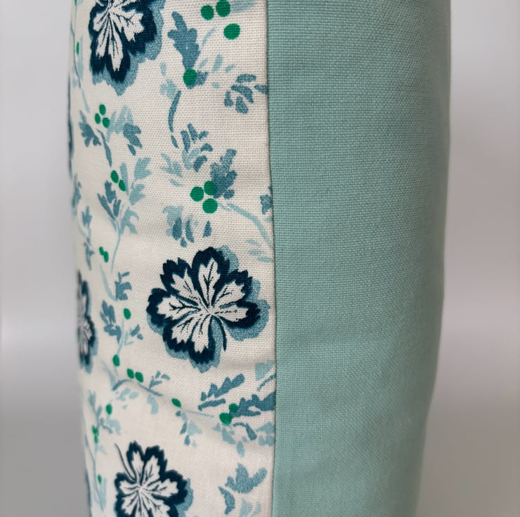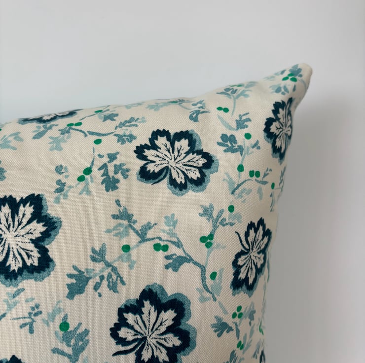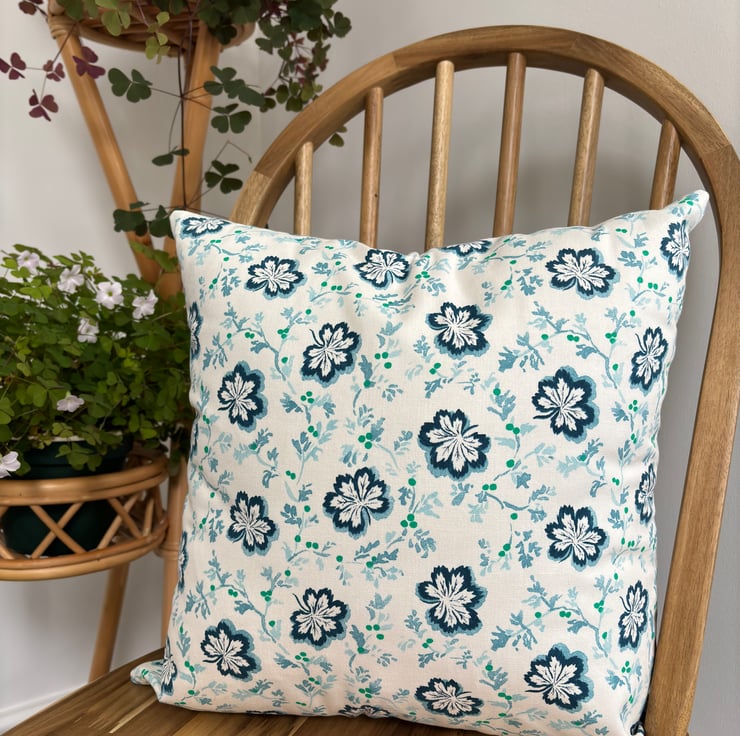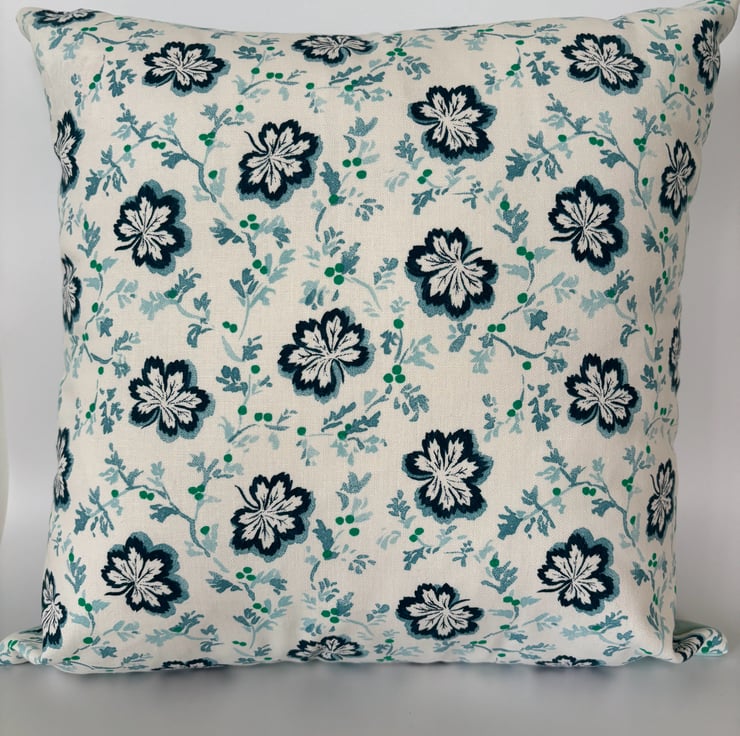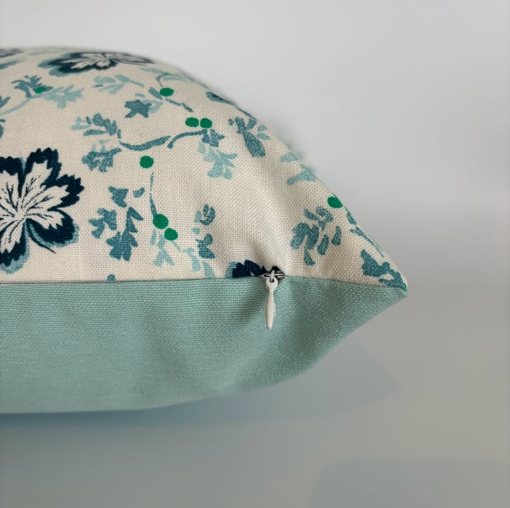 This beautiful cushion cover in a Designers Guild plain weave cotton fabric shows trailing camomile leaf prints in shades of blue, aqua and cream. The cushion is backed with a soft plain cotton in azure and is finished with an invisible zip.