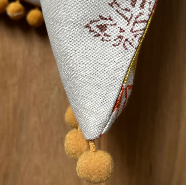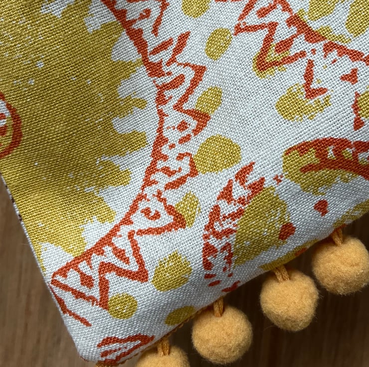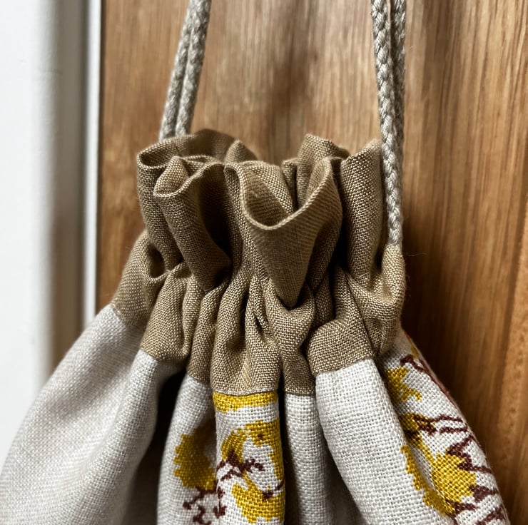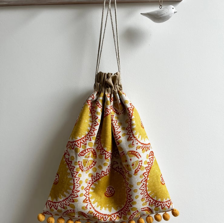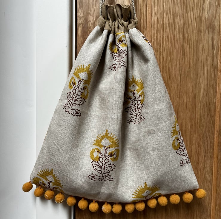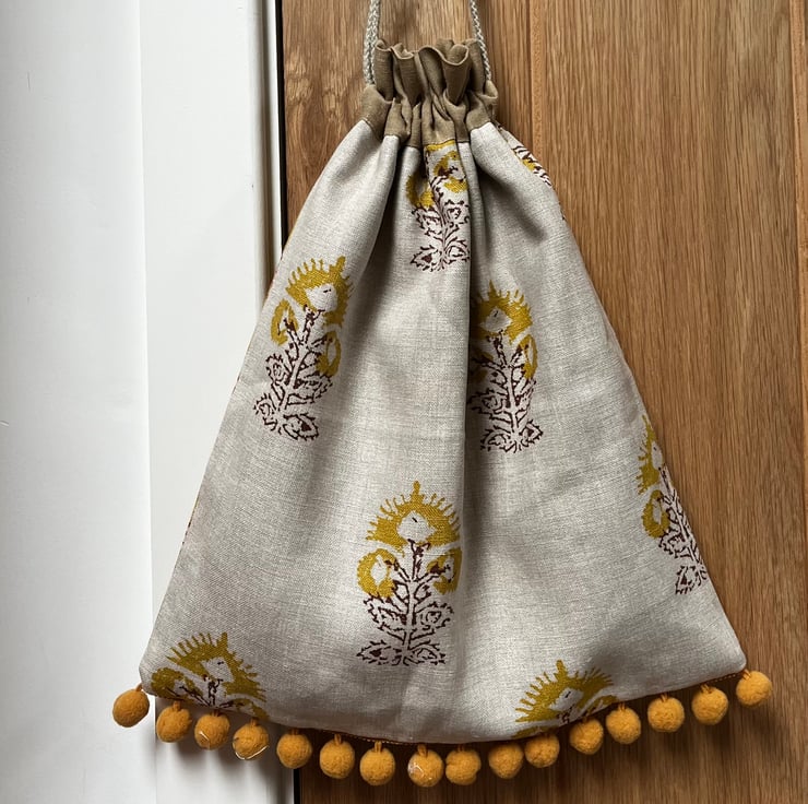 Pretty one of a kind drawstring bag in two coordinating Kate Foreman linen-mix fabrics in pretty shades of ochre orange and cream. Fully lined with butterscotch plain linen and finished with mustard pompoms.