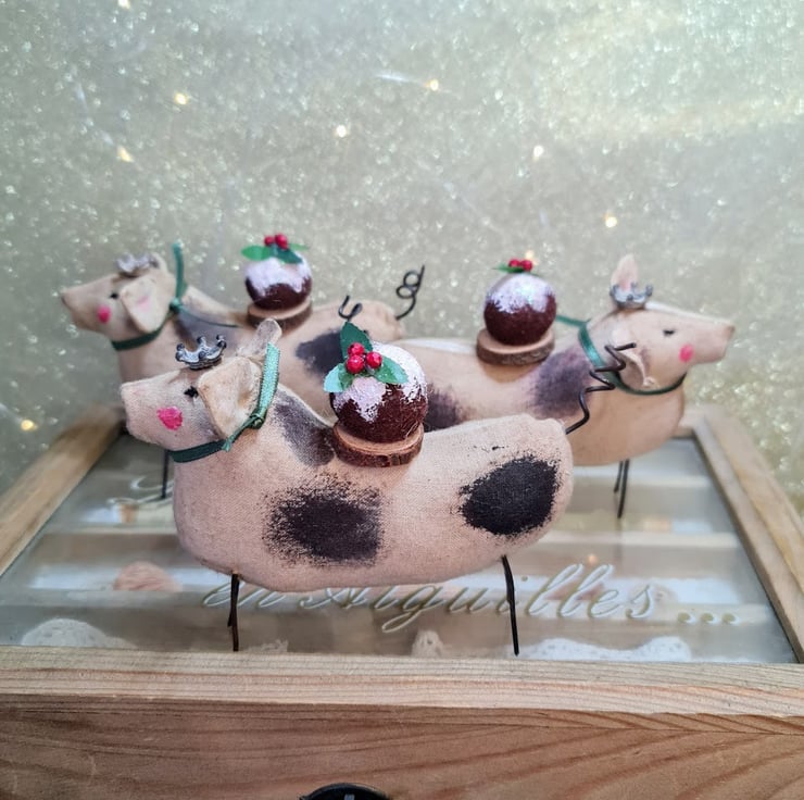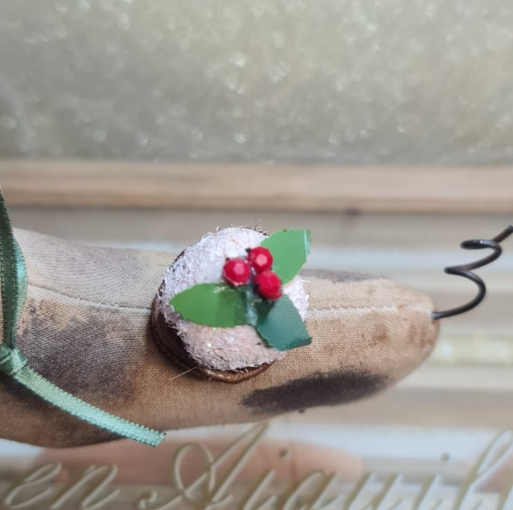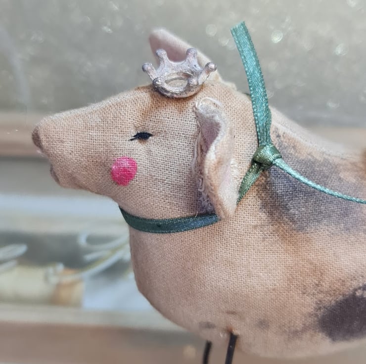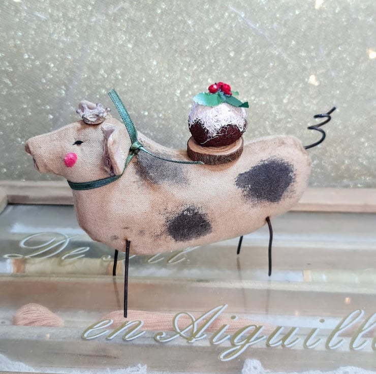 This wonderfully quirky little piece is made from unbleached cotton. Hand stained and painted to give an aged vintage feel. Pig has rusty wire legs and tail, and on his head is a little worn metal crown and a green satin ribbon around his neck to compete the look. On his back is a little wood platter with the Christmas pud he is delivering to his friends.