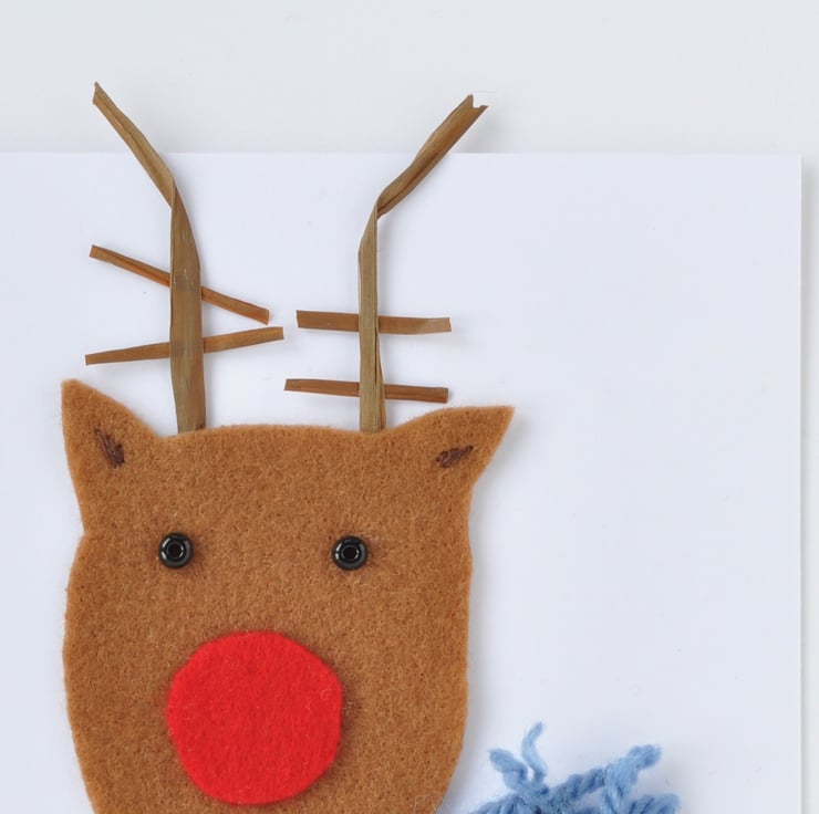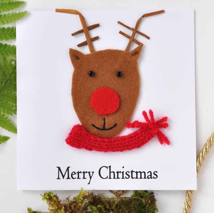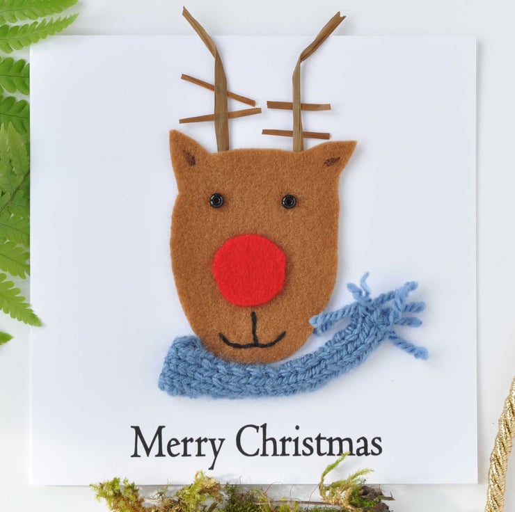 This Rudolph Christmas card complete with decorative scarf is ready to send season's greetings to someone special this year.