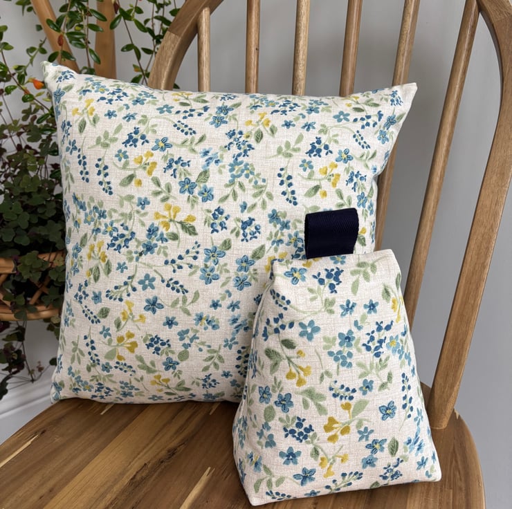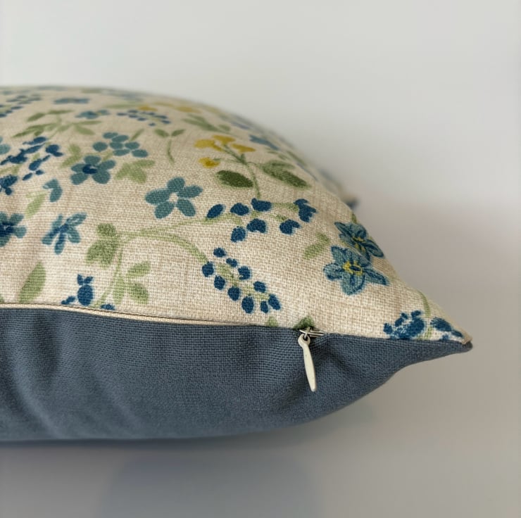 A pretty cushion cover in a delicate floral design in yellow, blue and green. A perfect country garden print on a quality cotton fabric from Studio G. The cushion is backed with a soft plain cotton in chambray blue and is finished with an invisible zip.