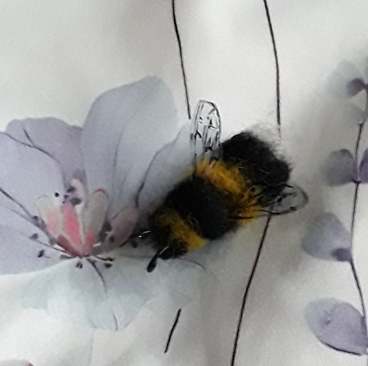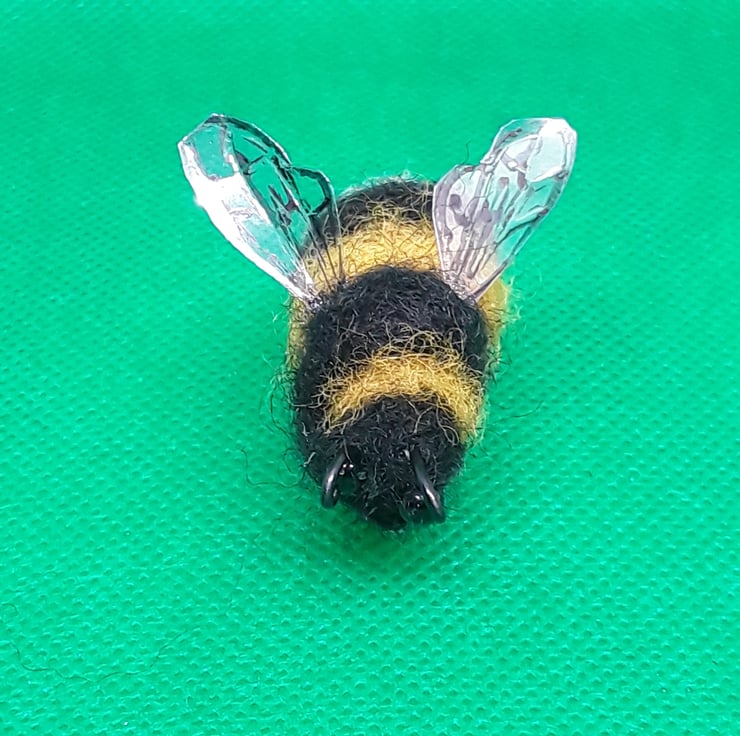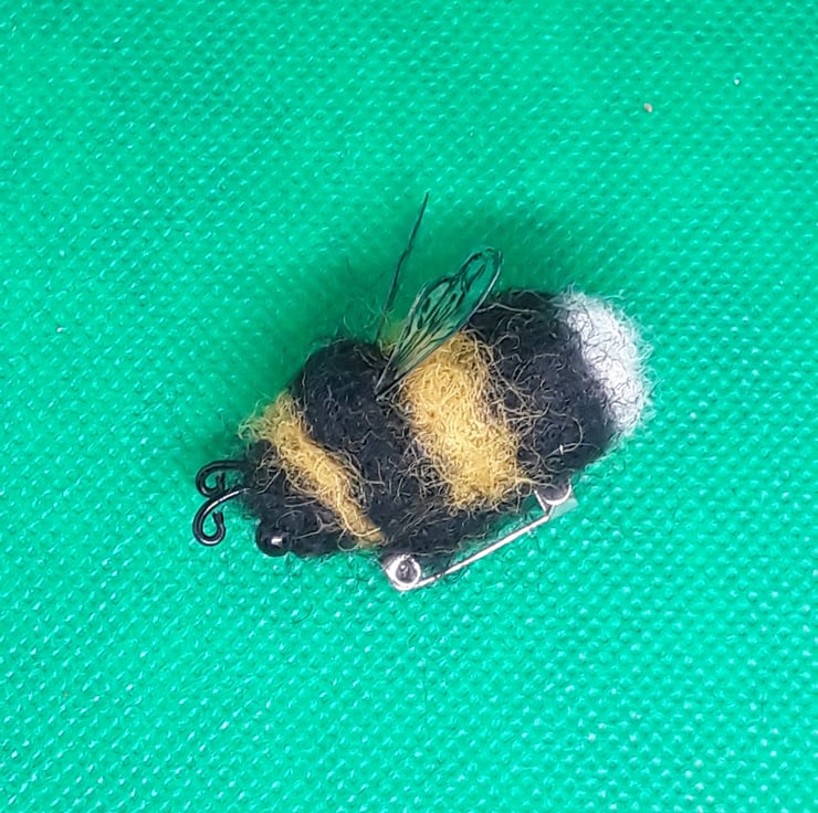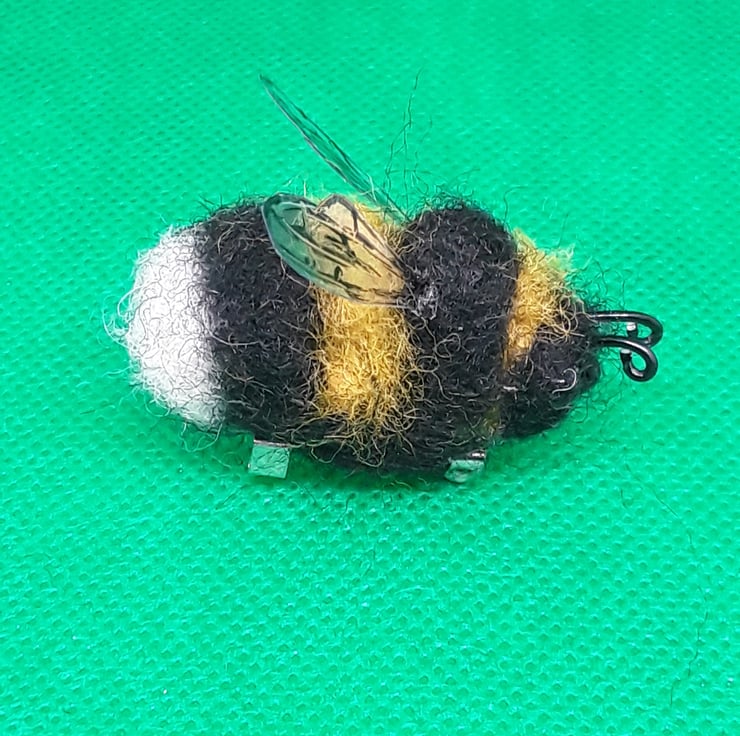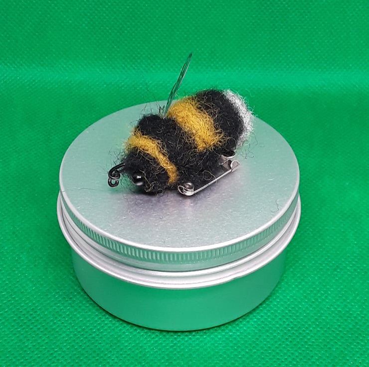 Needle felted bumblebee brooch, realistic bumblebee brooch life size, this little bumblebee will have them all fooled it does look quite realistic, comes in it's own little aluminium tin for protection a unique gift for anyone fond of nature, and it wont fly away, will look great pinned on a coat, blouse, jacket, hat etc.This item is not a toy and is not suitable for children. Price includes p&p
