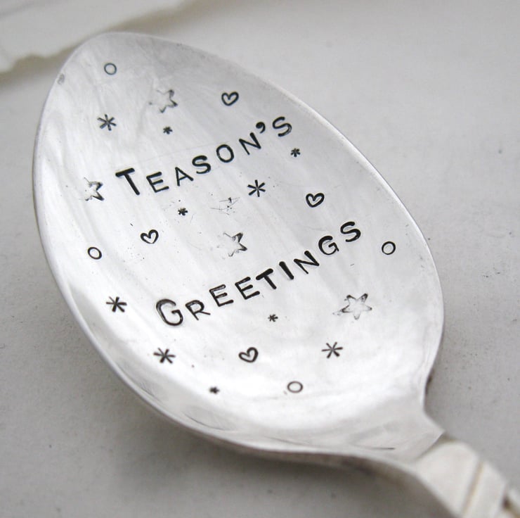 A vintage teaspoon with the words 'Teason's Greetings' hand stamped in the bowl along with some stars and snowflakes. It's a silverplated spoon approx. 13cm long and has a floral handle. The handstamped wording is coloured black with water-based acrylic paint. Hand wash with care.