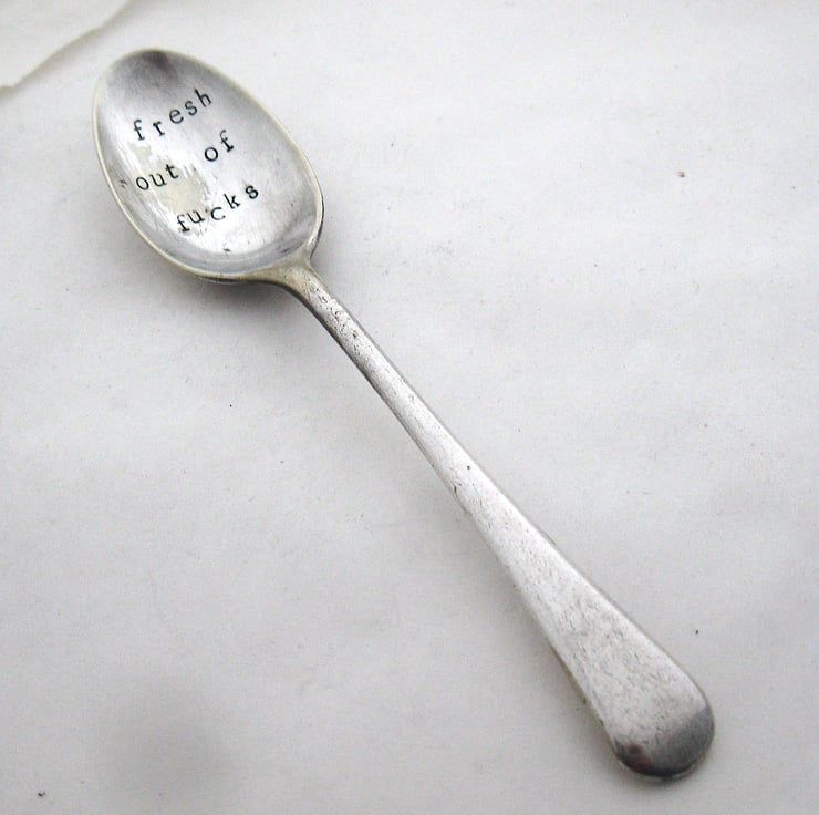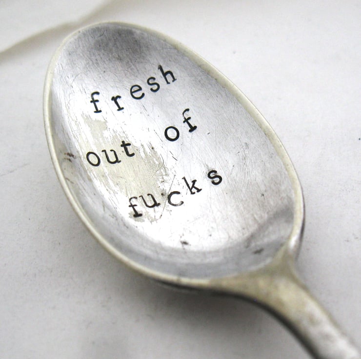 A rude sweary vintage teaspoon hand stamped with 'fresh out of f--ks'. For when you are really, REALLY done with everything and could absolutely not care less. The spoon is old, battered, scratched and scarred, it has residual tarnish I couldn't be bothered to remove, and the lettering is pretty wonky even by my standards, so it's in the bargain bin for a mere fiver and I hope you or someone you know will enjoy it!
