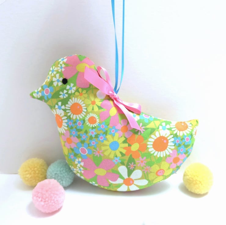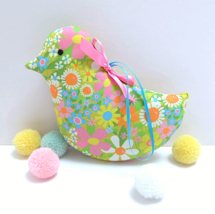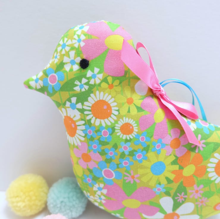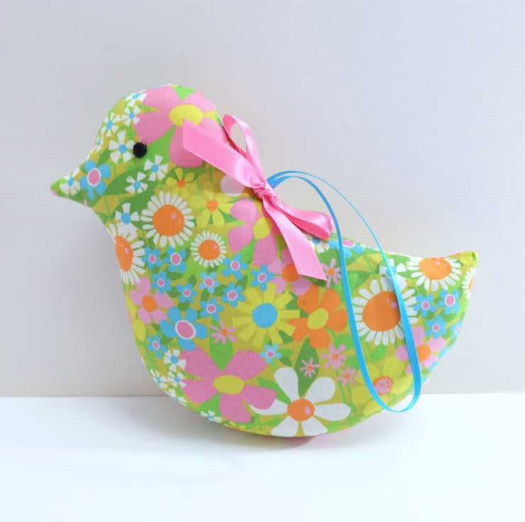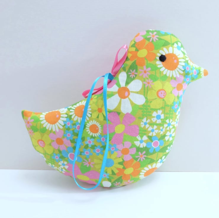I've used a retro style lime green cotton fabric, with flowers in pink, orange, yellow, turquoise, pink and white and green leaves. The bird is packed with scoops of fresh, strongly scented lavender and toy stuffing for a good shape. I have hand sewn black embroidery cotton eyes on each side of the head and finished it with a pink satin ribbon bow.