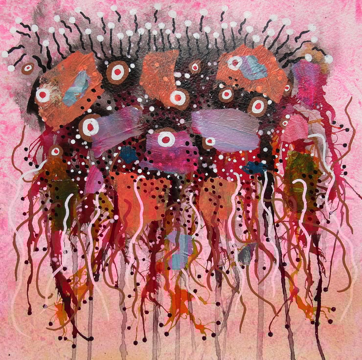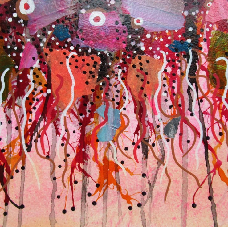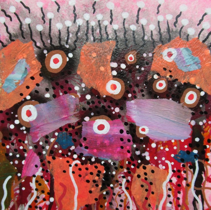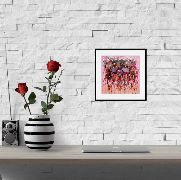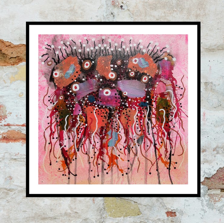 Vibrant 10 x 10 inch original abstract painting in acrylic, ink, collage drawing pens on lightly textured heavy watercolour paper. The artwork comes to you unframed (framed photo is for illustration purposes only) but is the ideal dimensions to pop straight into any standard sized 10 x 10 inch frames or mount. The painting will be hand signed on the front by Bea before dispatch.