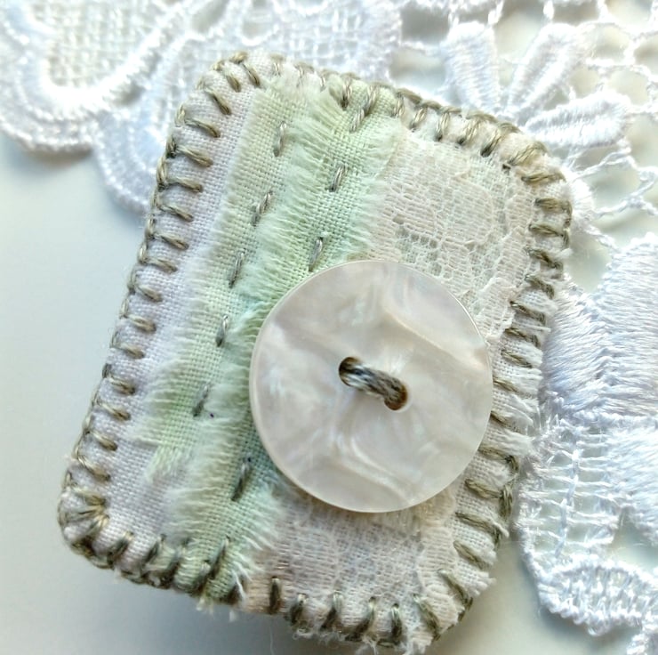 A pretty handmade brooch created with tiny fragments of hand painted and hand stitched fabric.