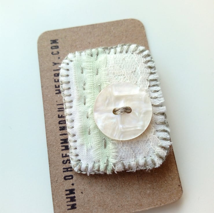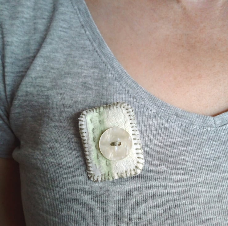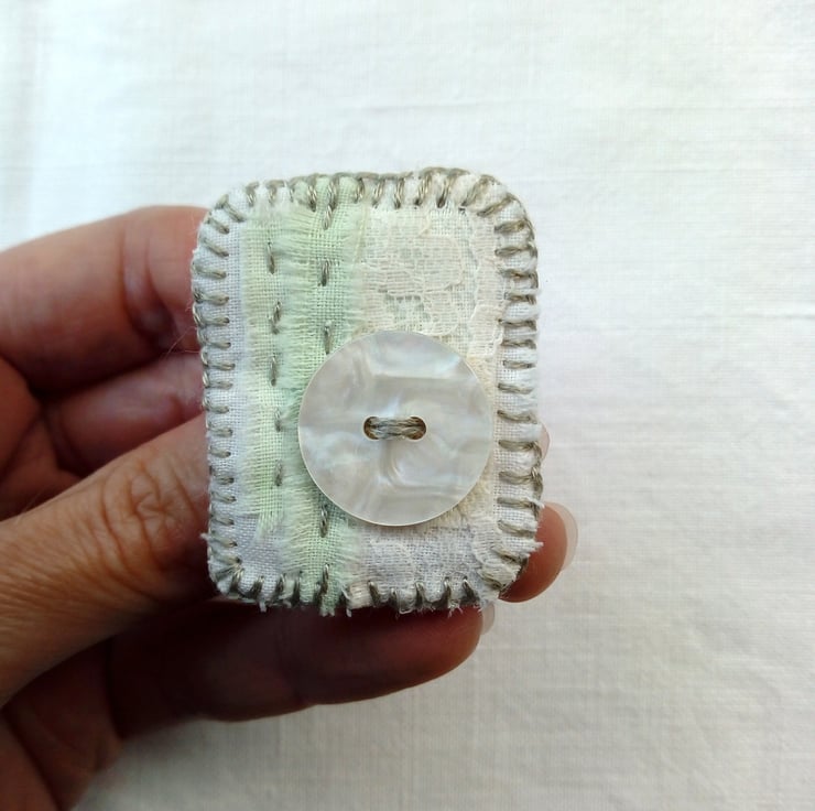 A pretty handmade brooch created with tiny fragments of hand painted and hand stitched fabric.