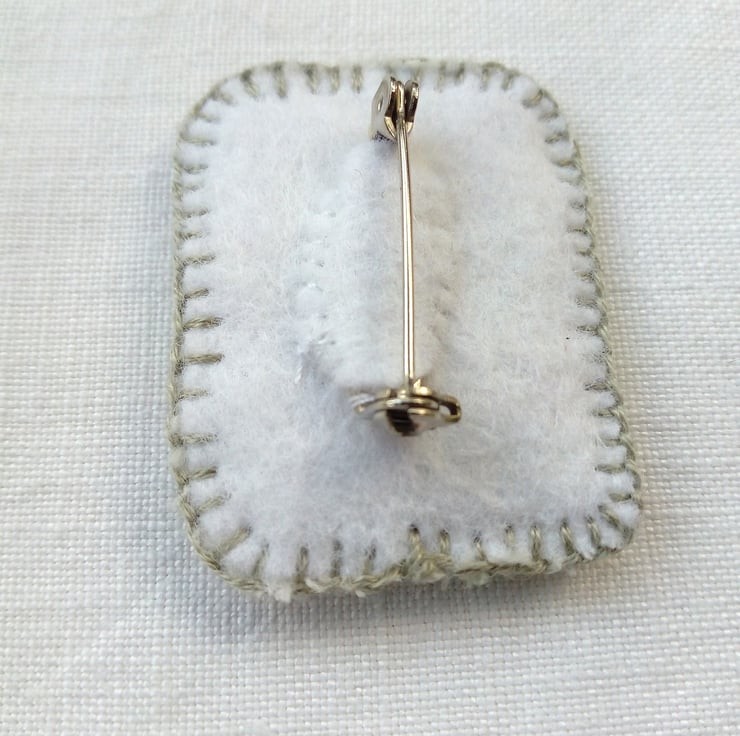 The brooch is backed with white felt, and has a silver bar brooch pin with a safety latch.