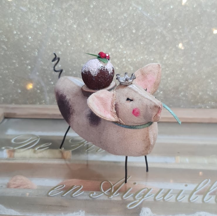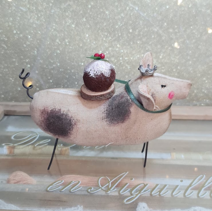 This wonderfully quirky little piece is made from unbleached cotton. Hand stained and painted to give an aged vintage feel. Pig has rusty wire legs and tail, and on his head is a little worn metal crown and a green satin ribbon around his neck to compete the look. On his back is a little wood platter with the Christmas pud he is delivering to his friends.