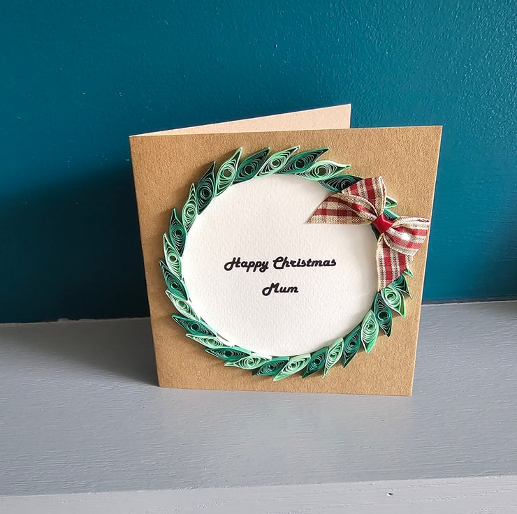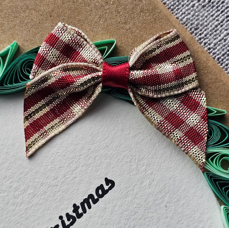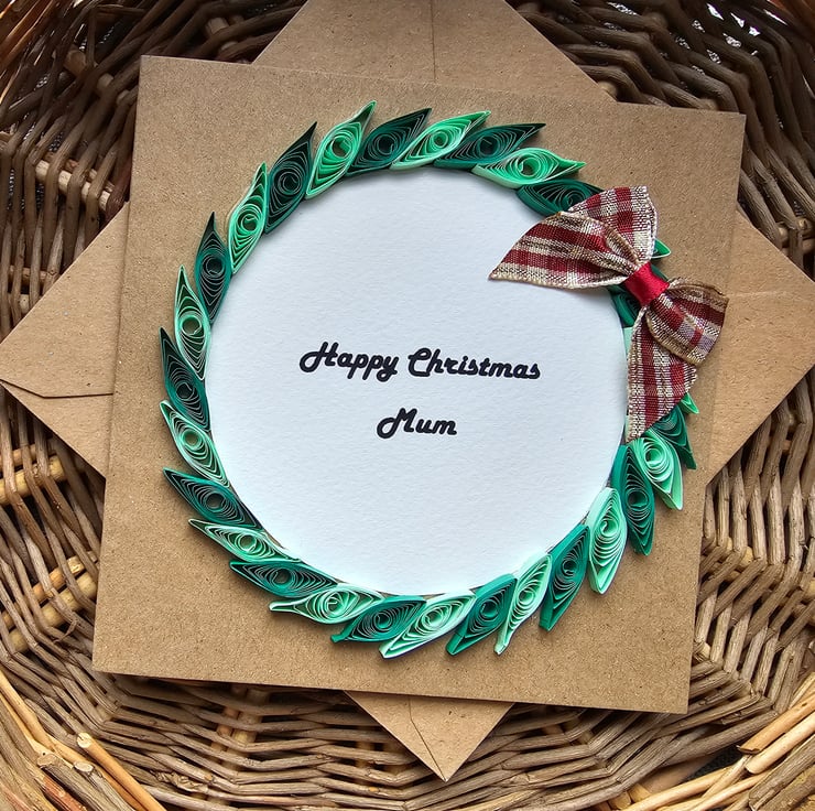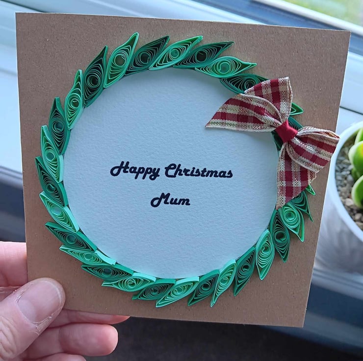 This card has been made using 2 tones of green quilling paper strips and a ribbon bow. The words are printed on quality Bockingford paper. The design is glued onto a brown kraft card.