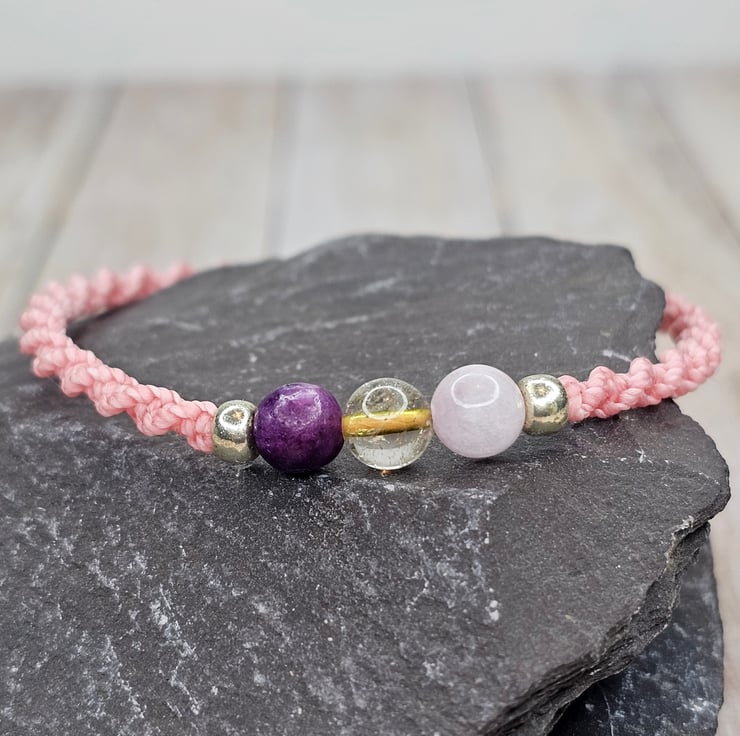 Strung on waxed Brazilian cord, made with Kunzite, Rutilated Quartz and Lepidolite round beads (6mm).