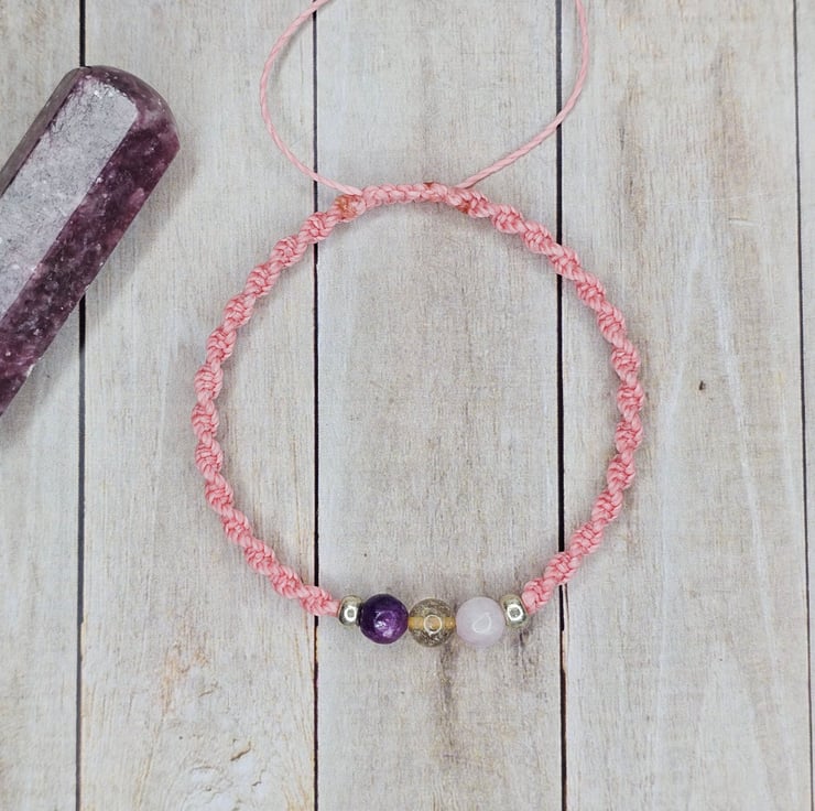 Finished with Clear Quartz (4mm) beads and a sliding knot closure.