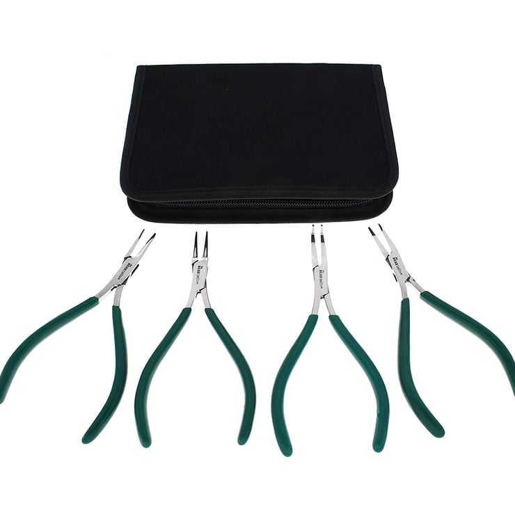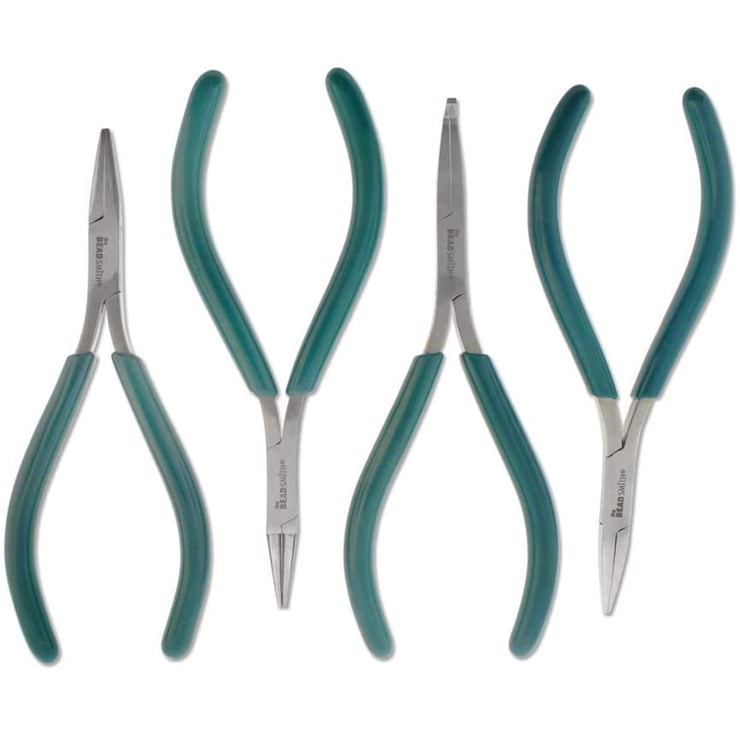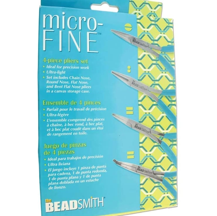 4 Piece BeadSmith Micro-Fine Plier Kit. Includes Round Nose, Chain Nose, Flat Nose and Bent Flat Nose in Black Canvas Case. Steel Head, Curved Cushioned Handles and Boxjoint Construction.