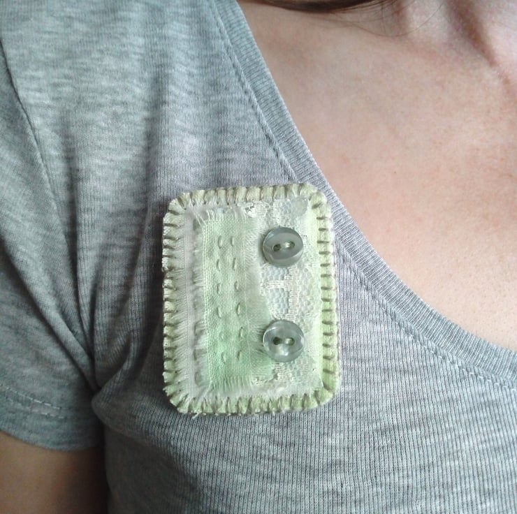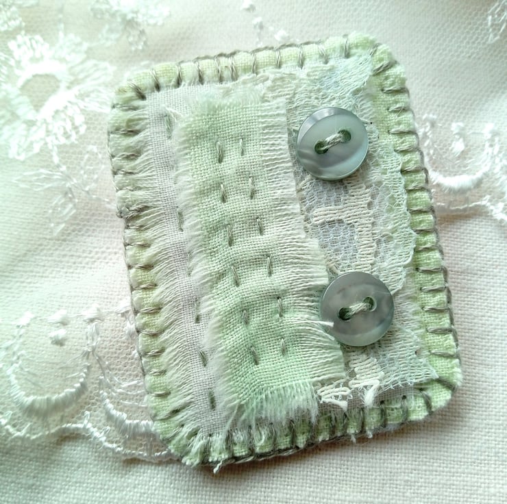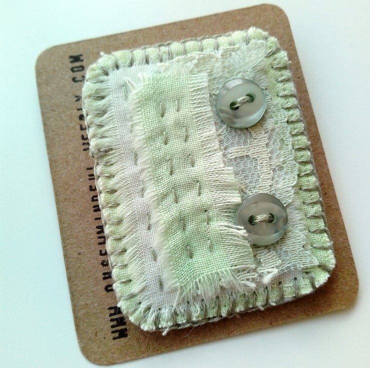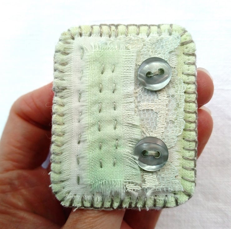 A handmade brooch created with tiny fragments of hand painted and hand stitched fabric.