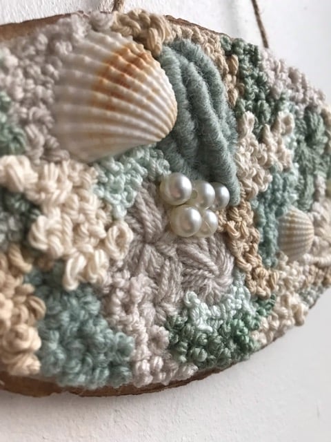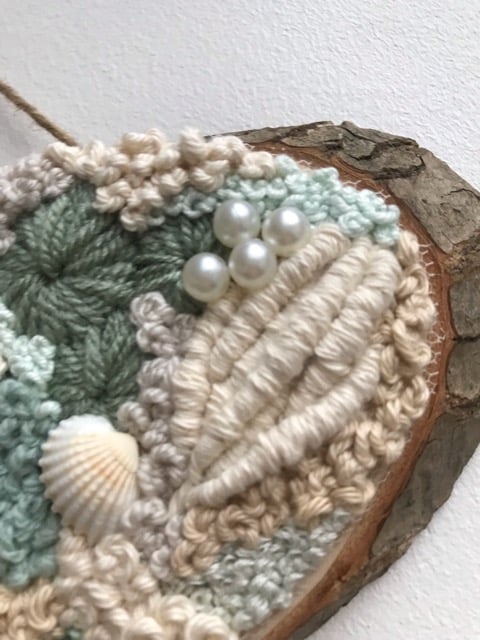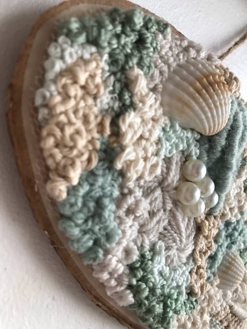 Driftwood a one of a kind hand embroidered art piece. Embroidery thread, yarn, shells and beads have been hand embroidered onto a white tulle. The finished piece has then been placed onto a 7 x 4 inch real wood disc with hanging string. This is a unique and eye catching art piece.