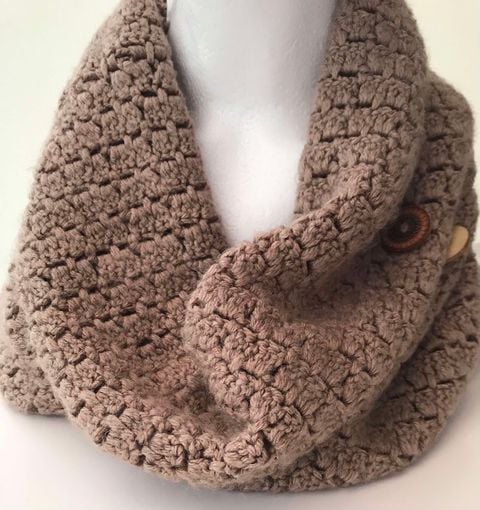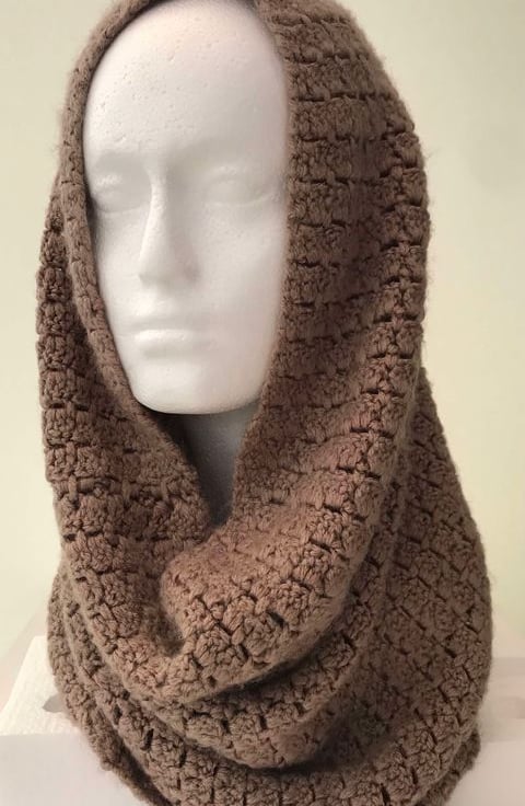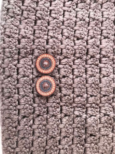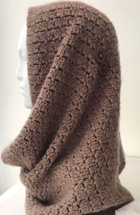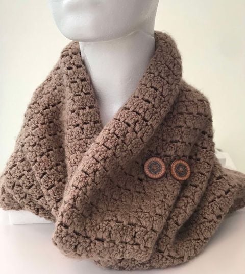 Hooded scarf or/and neck warmer, handmade crocheted. Soft brown yarn with two buttons as decoration. They are not removable .