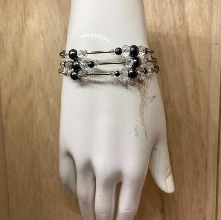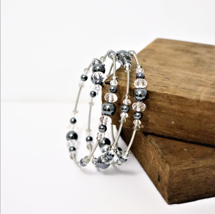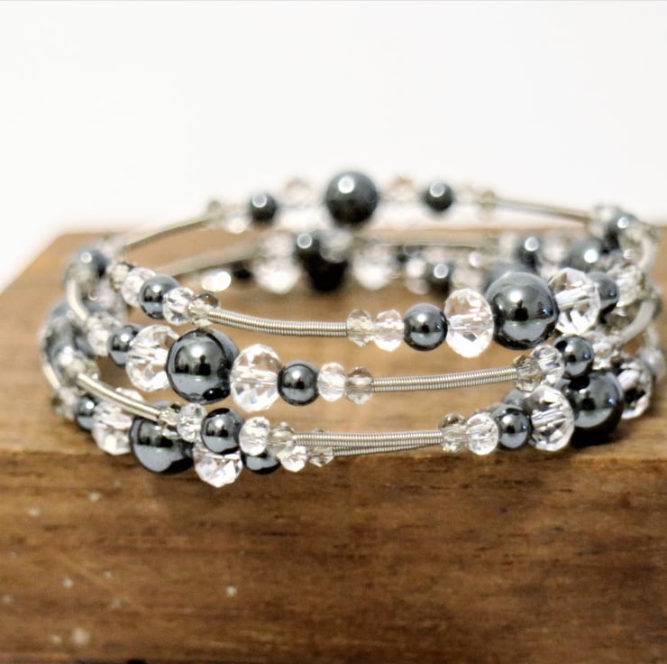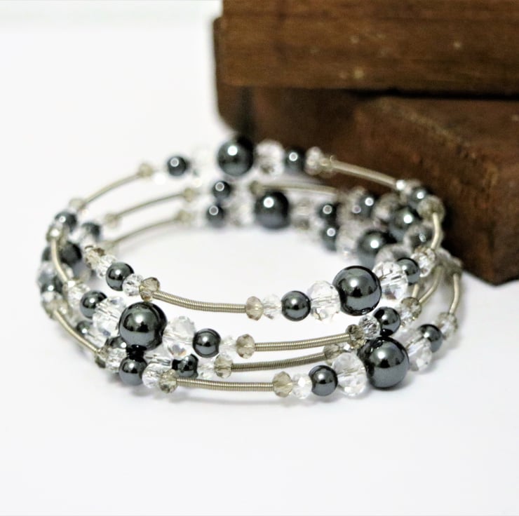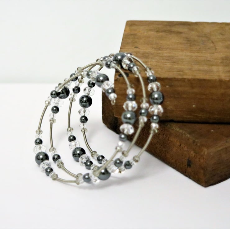 Semi precious Hematite stones beaded wrap bangle, with Steel Bracelet Memory Wire, featured with clear and ash grey crystal beads bangle.