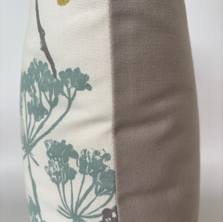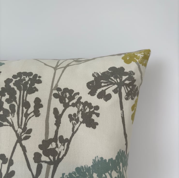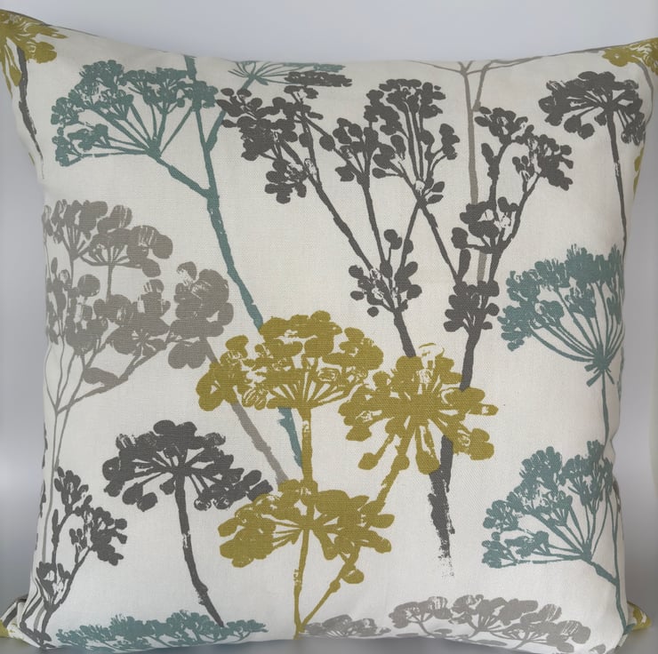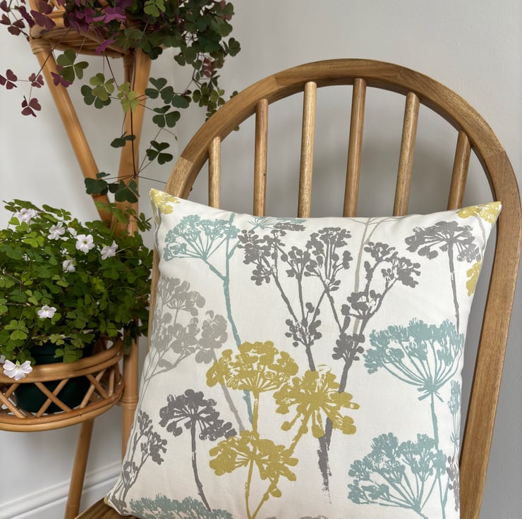 Cow parsley print cushion cover with blue, grey and mustard stylised floral stems on a cream background. A fresh, crisp botanical print in a quality cotton fabric from Studio G. The cushion is backed with a soft plain cotton in grey and is finished with an invisible zip.