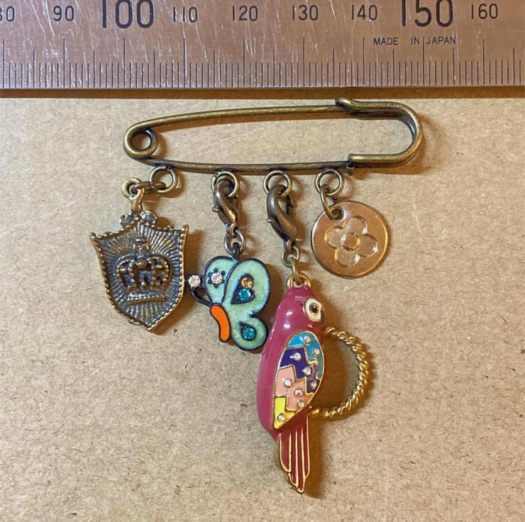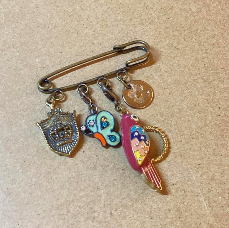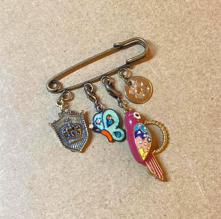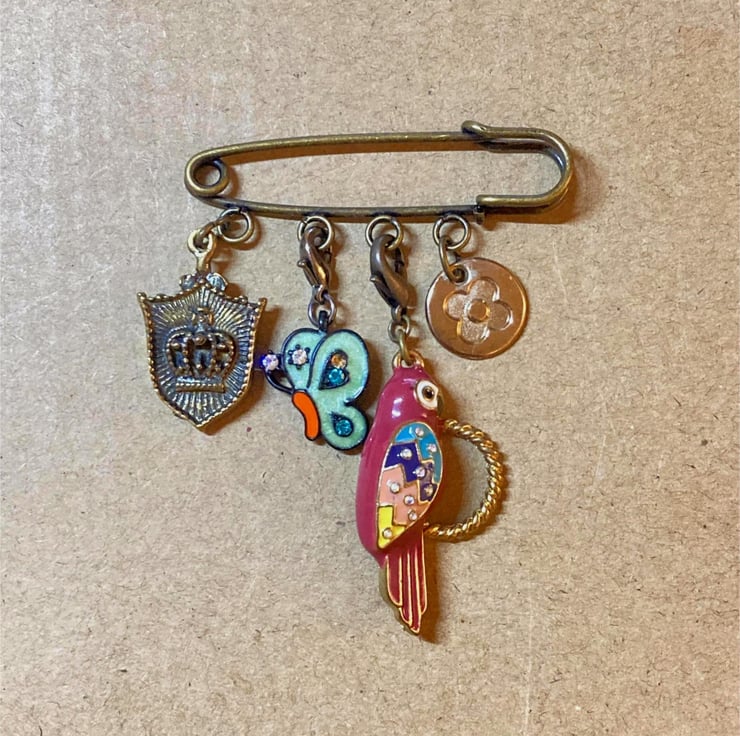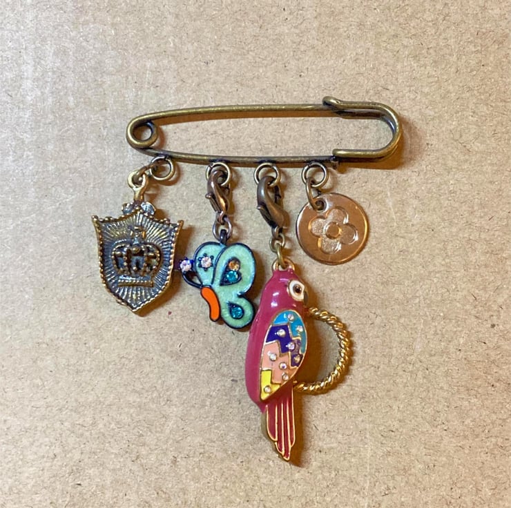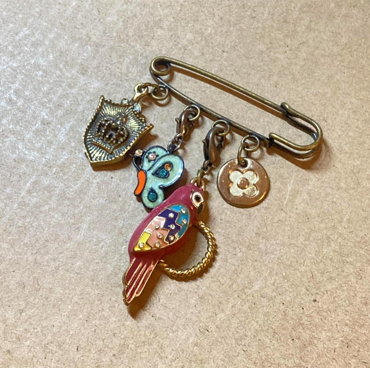 Upcycled Parrot Bird and Butterfly Pin - Lapel Pin - Handmade