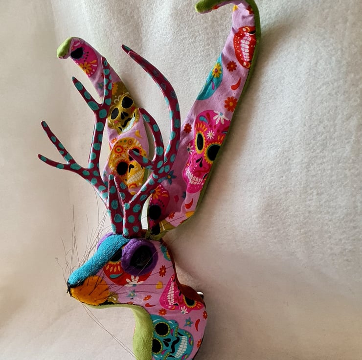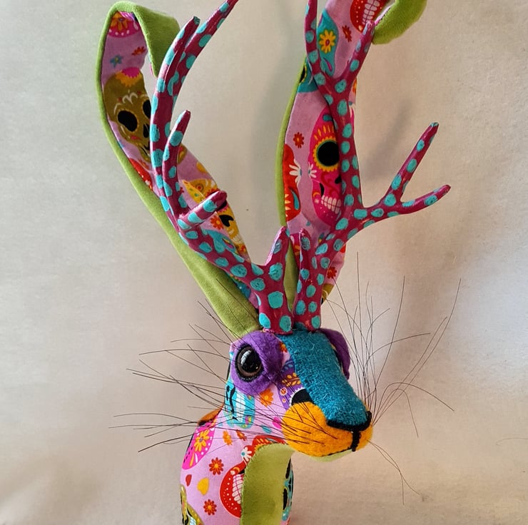 A lifesize faux jackalope (mythical hare with antlers) which I have handmade and covered in hand stitched Day of the dead skull fabric, upholstery fabric and velvet. The jackalope has hand painted antlers, giving a nod to the Mexican tradition of hand painted Alebrijes from Oaxaca.