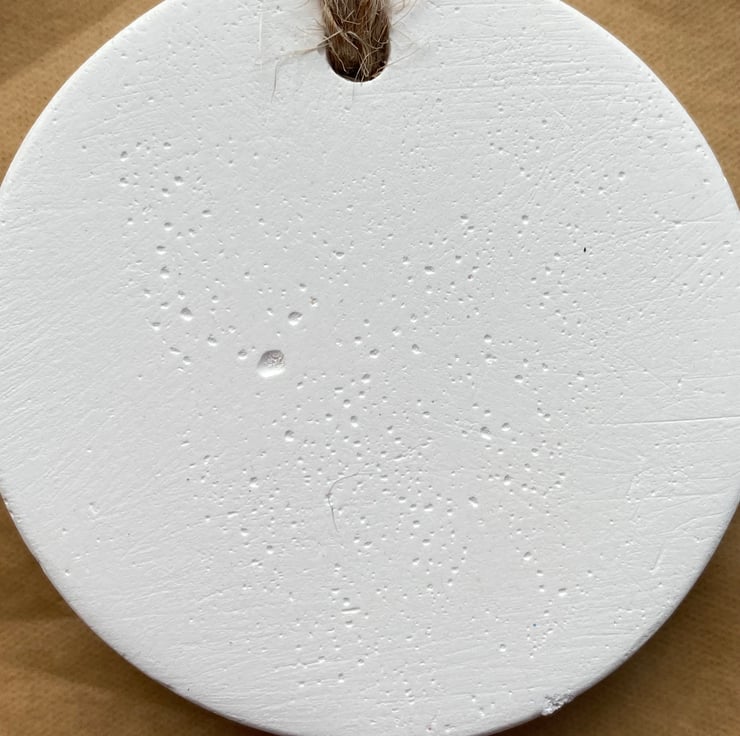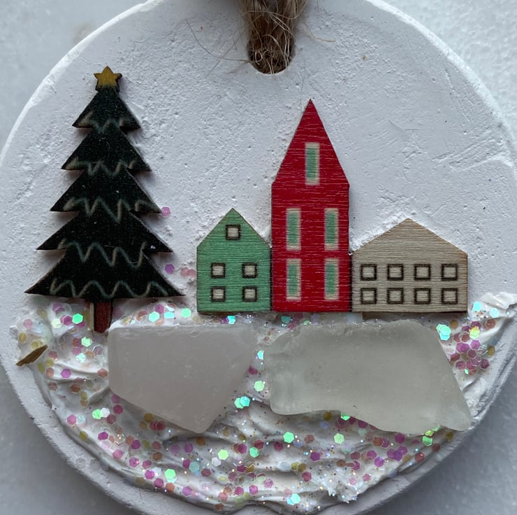 Unglazed ceramic disc decorated with wood embellishments and sea glass from the beaches of Cornwall. Finished with glitter and a bell.