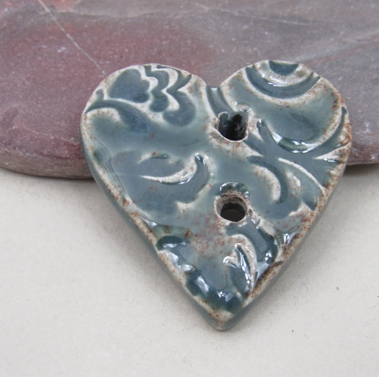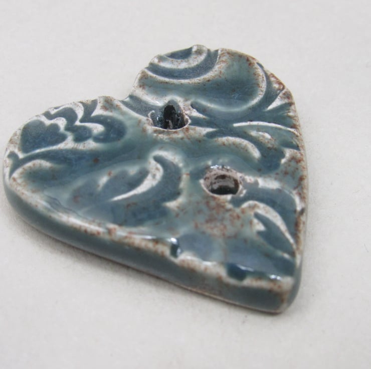 Medium heart shaped stoneware button, textured with a bold leaf and flower motif.