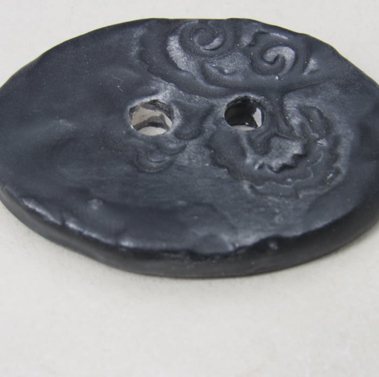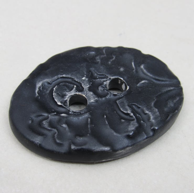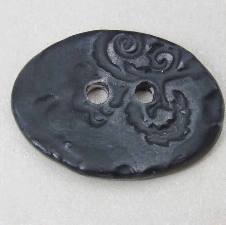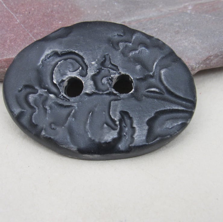 Medium oval shaped stoneware button, textured with a pretty brocade motif.