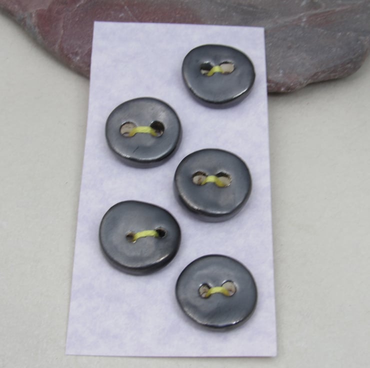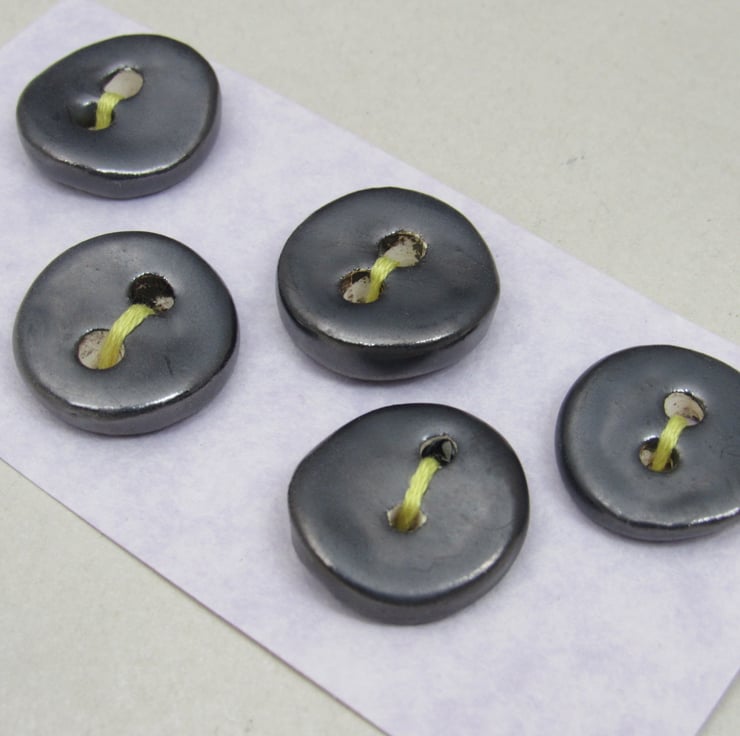 5 small stoneware buttons finished with a dark metallic pewter glaze