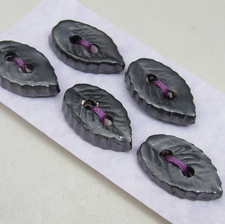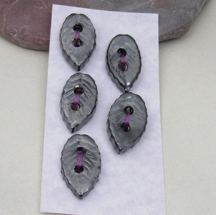 5 small stoneware buttons cut to a toothed leaf shape and finished with a dark metallic pewter glaze