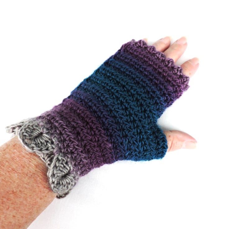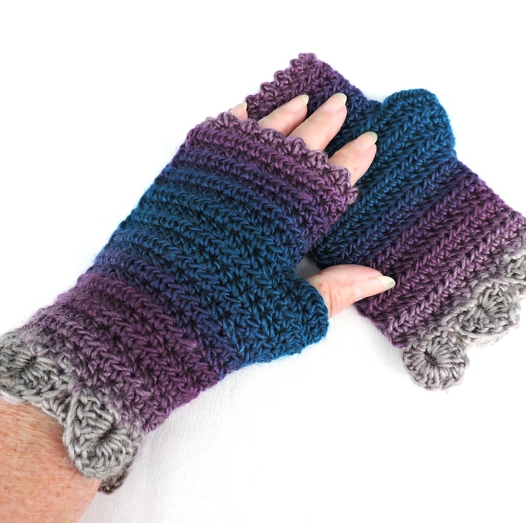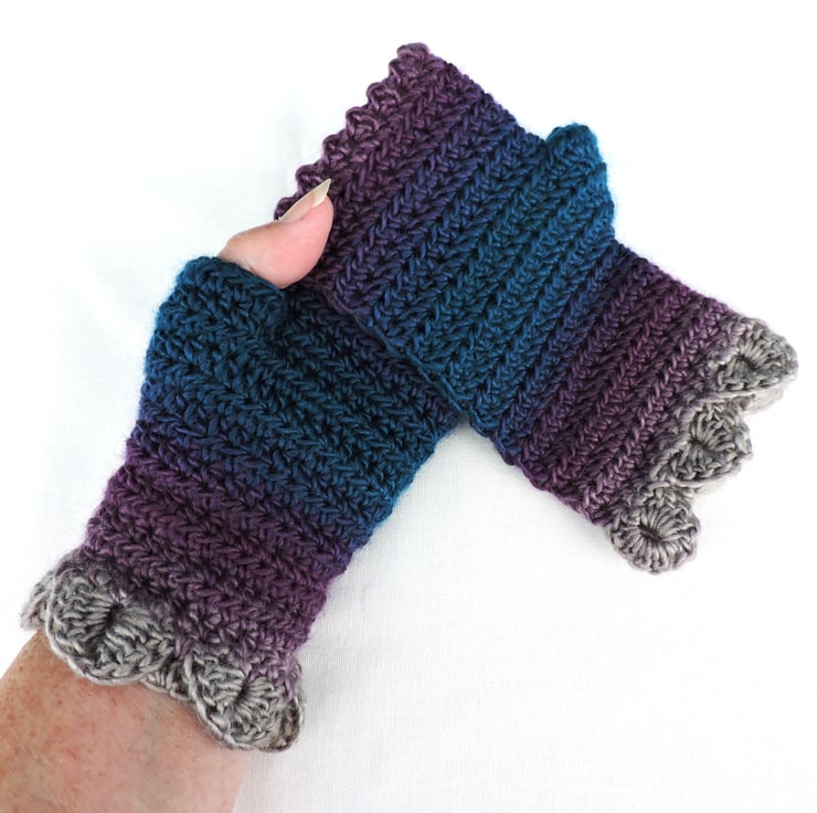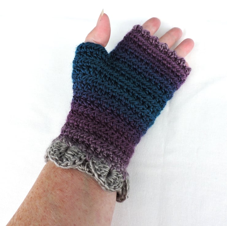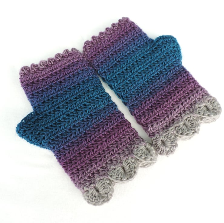 Adults dragon scale cuff fingerless mitts. These colourful mitts have been crocheted with a self striping acrylic yarn, in graduated colours of peacock blue, mauve and grey. The mitts have a plain body with a single row of dragon scales at the cuffs and a picot edge to the top. An ideal winter warmer for those who like to keep their fingers free.