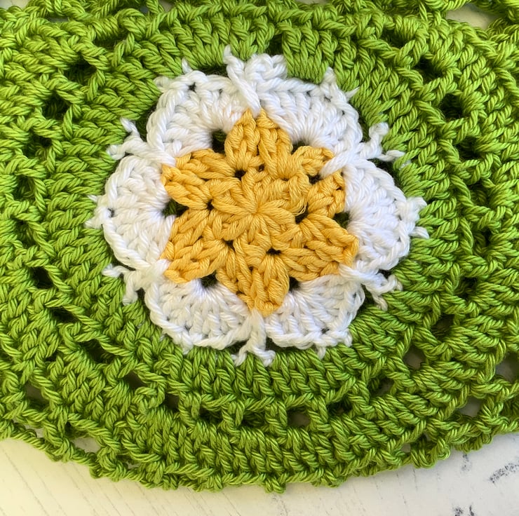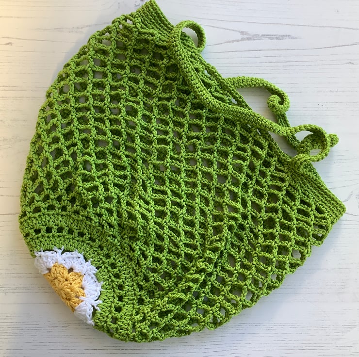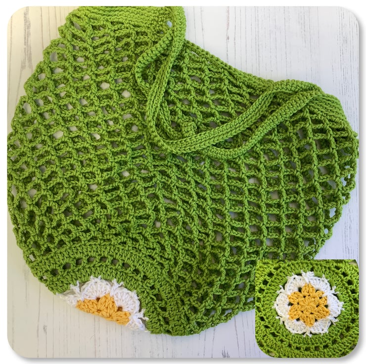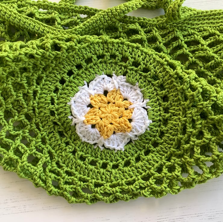 I have crocheted this simple netted style market shopping bag using a strong good quality cotton yarn in a lovely shade of apple green, the base of the bag is white and yellow daisy style flower.