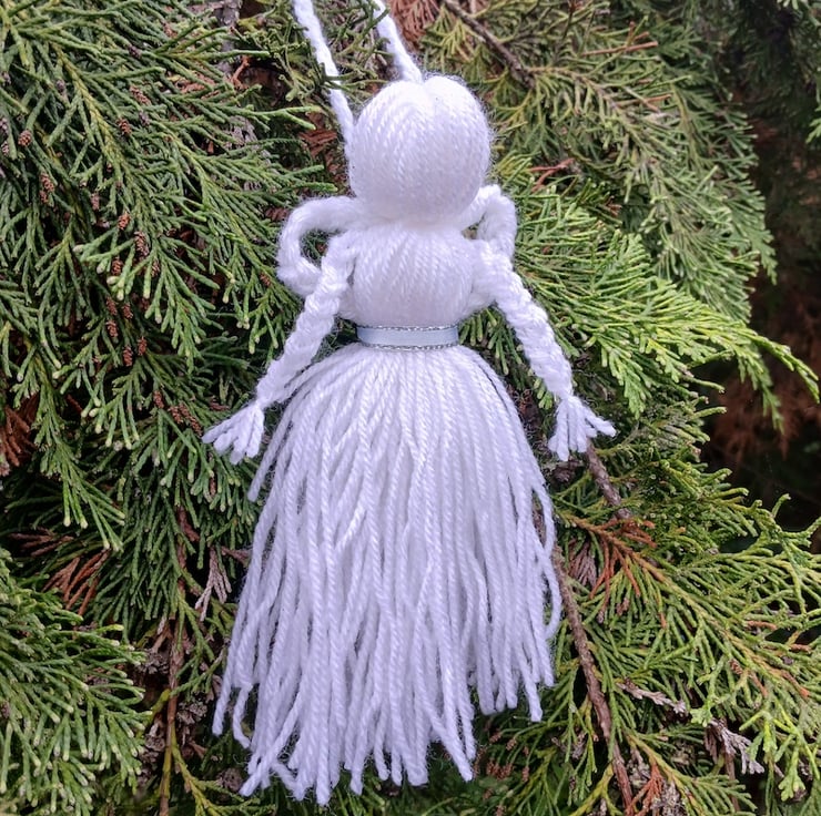 An angel decoration made with white yarn