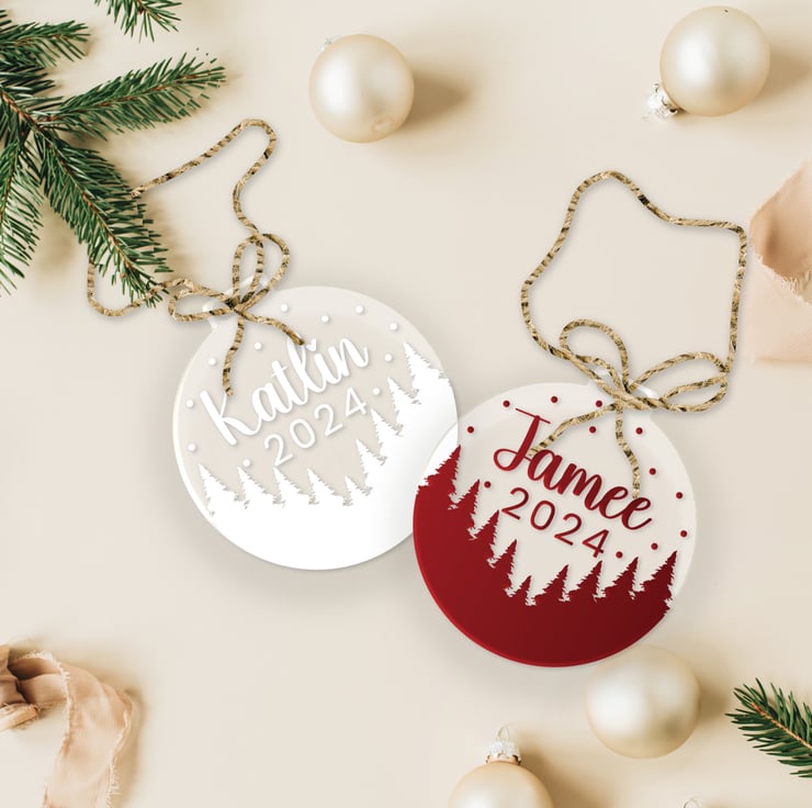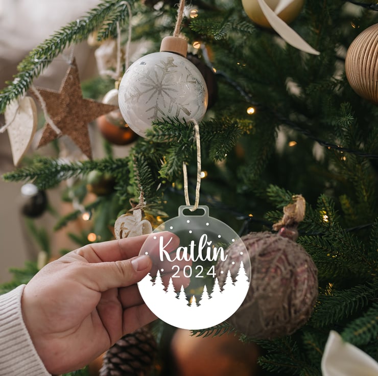 Celebrate a memorable holiday with our stunning personalised clear acrylic Christmas bauble, perfect for marking a "First Christmas" or any special year! This elegant ornament features a crystal-clear acrylic base with a sleek vinyl sticker overlay of your chosen name and year, giving it a unique, modern touch that will beautifully reflect your festive lights.