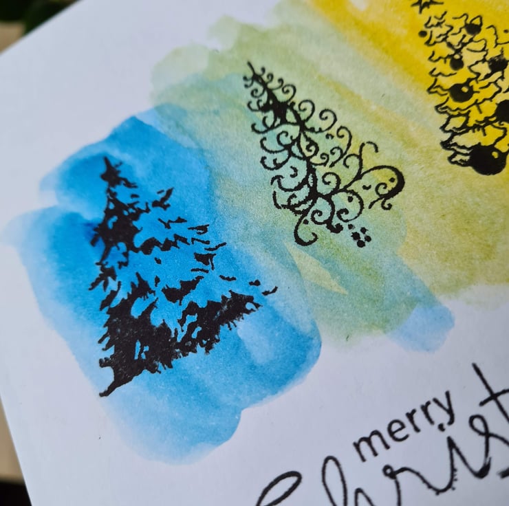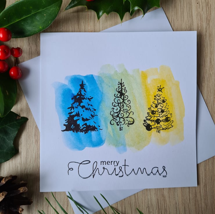 This is a handpainted watercolour Christmas card with stamped Christmas trees, on quality card, with a pretty blue/green/yellow background.